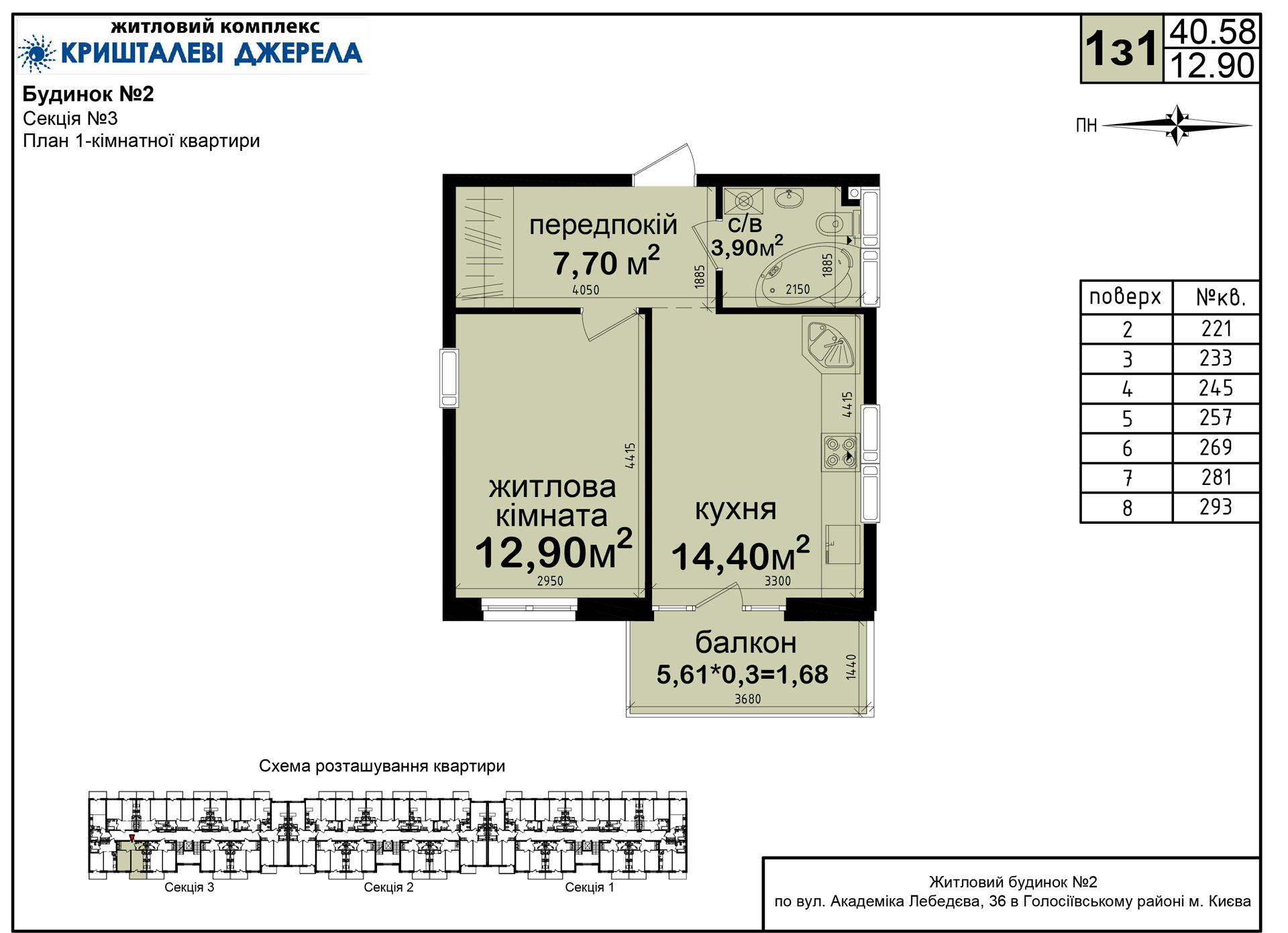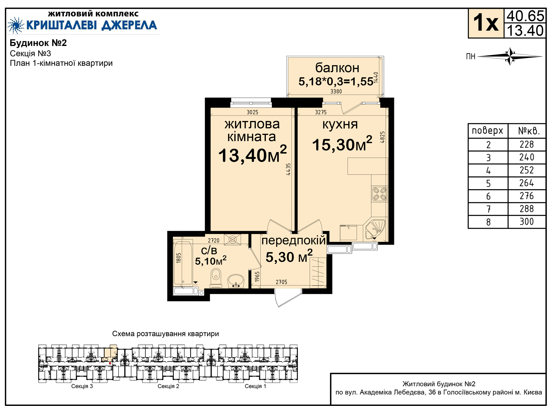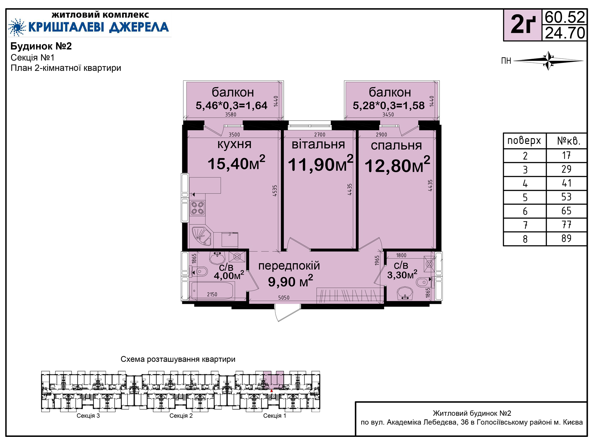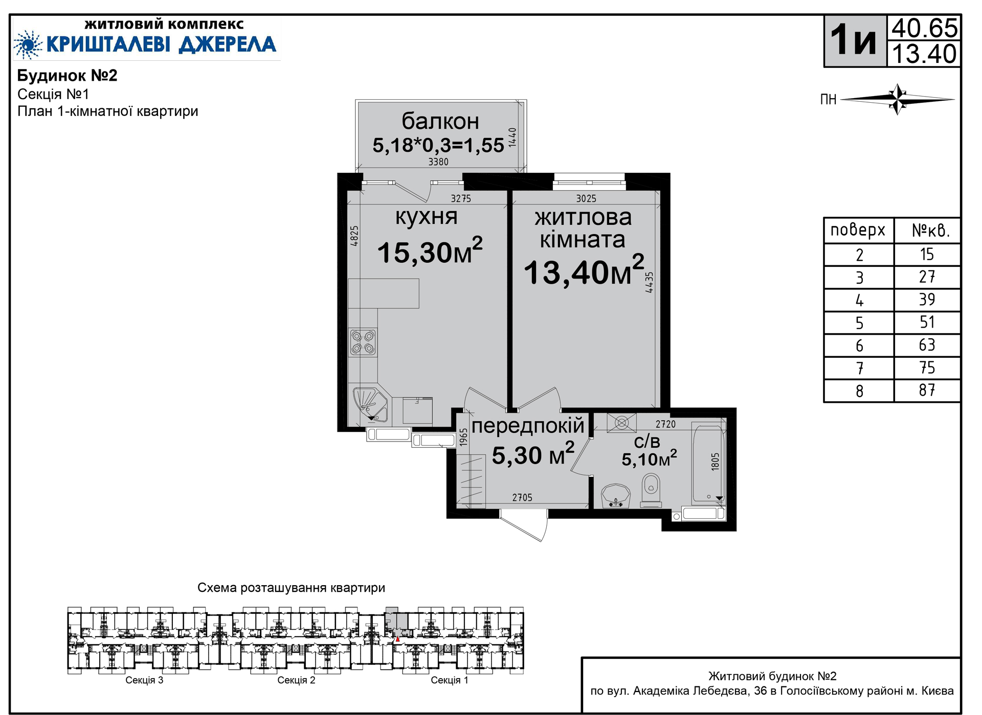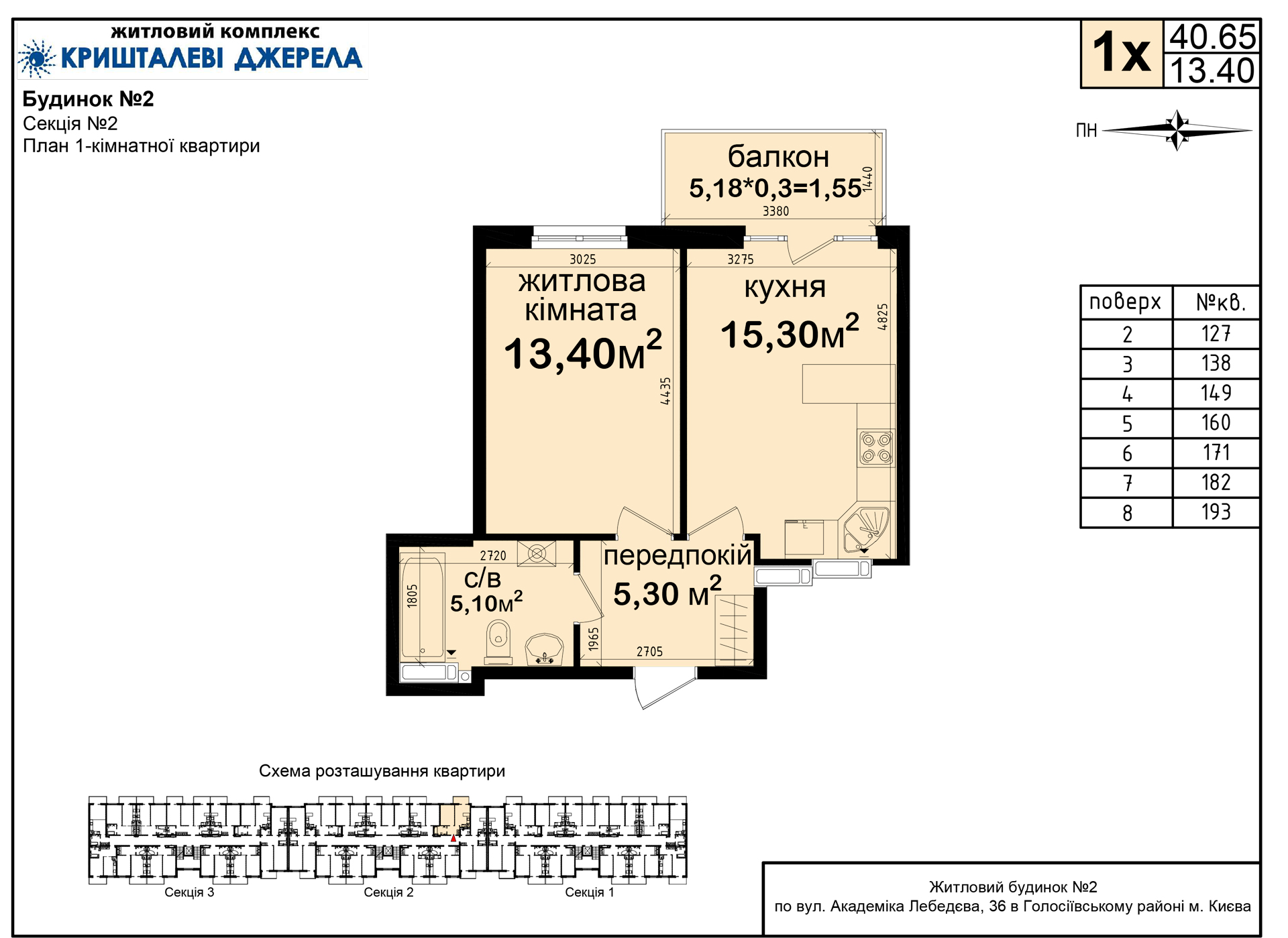 | № | Секція | Поверх | Кімнат | Площа, м2 | Ціна, грн/м2 | Ціна, грн | Статус |