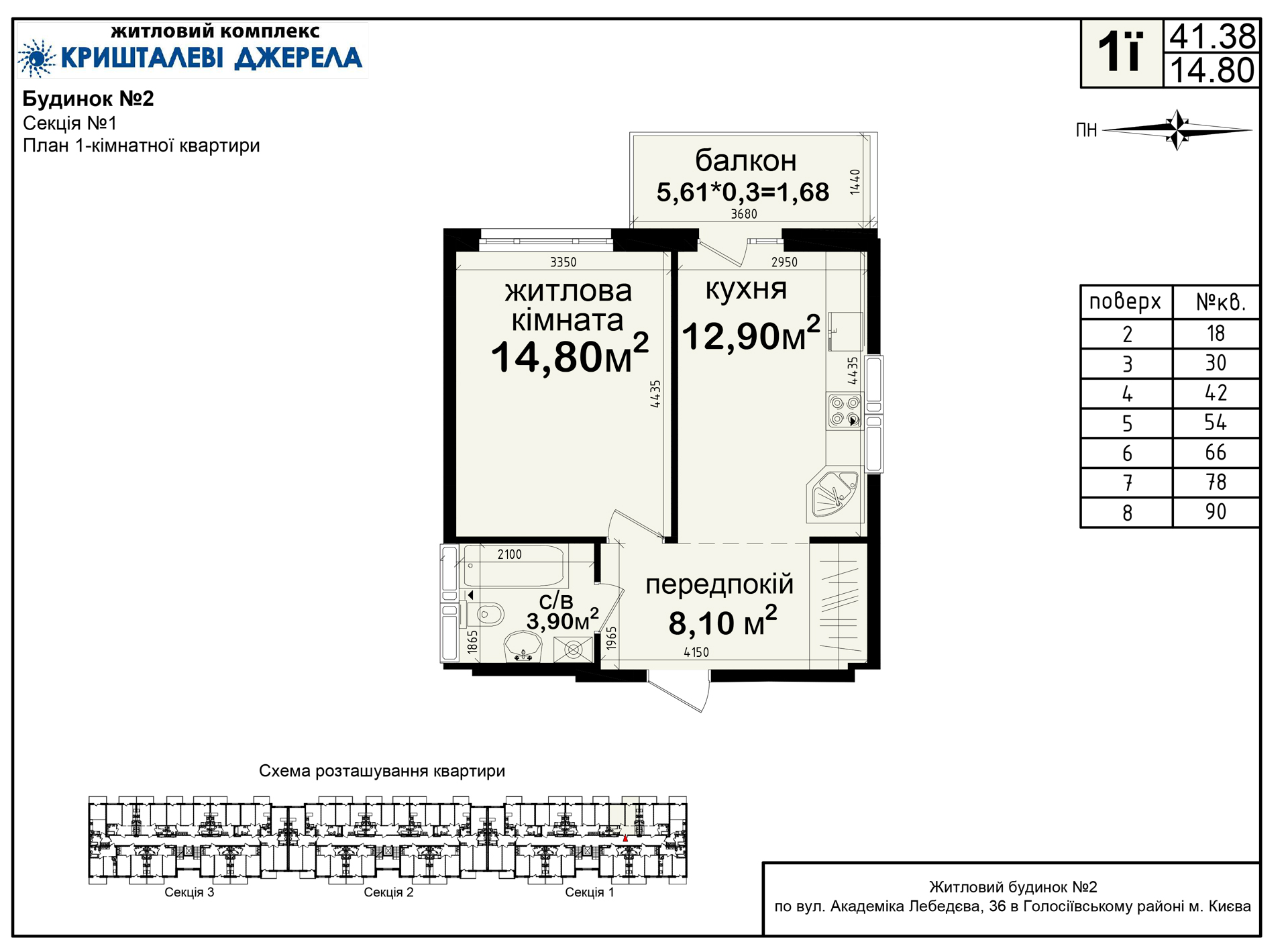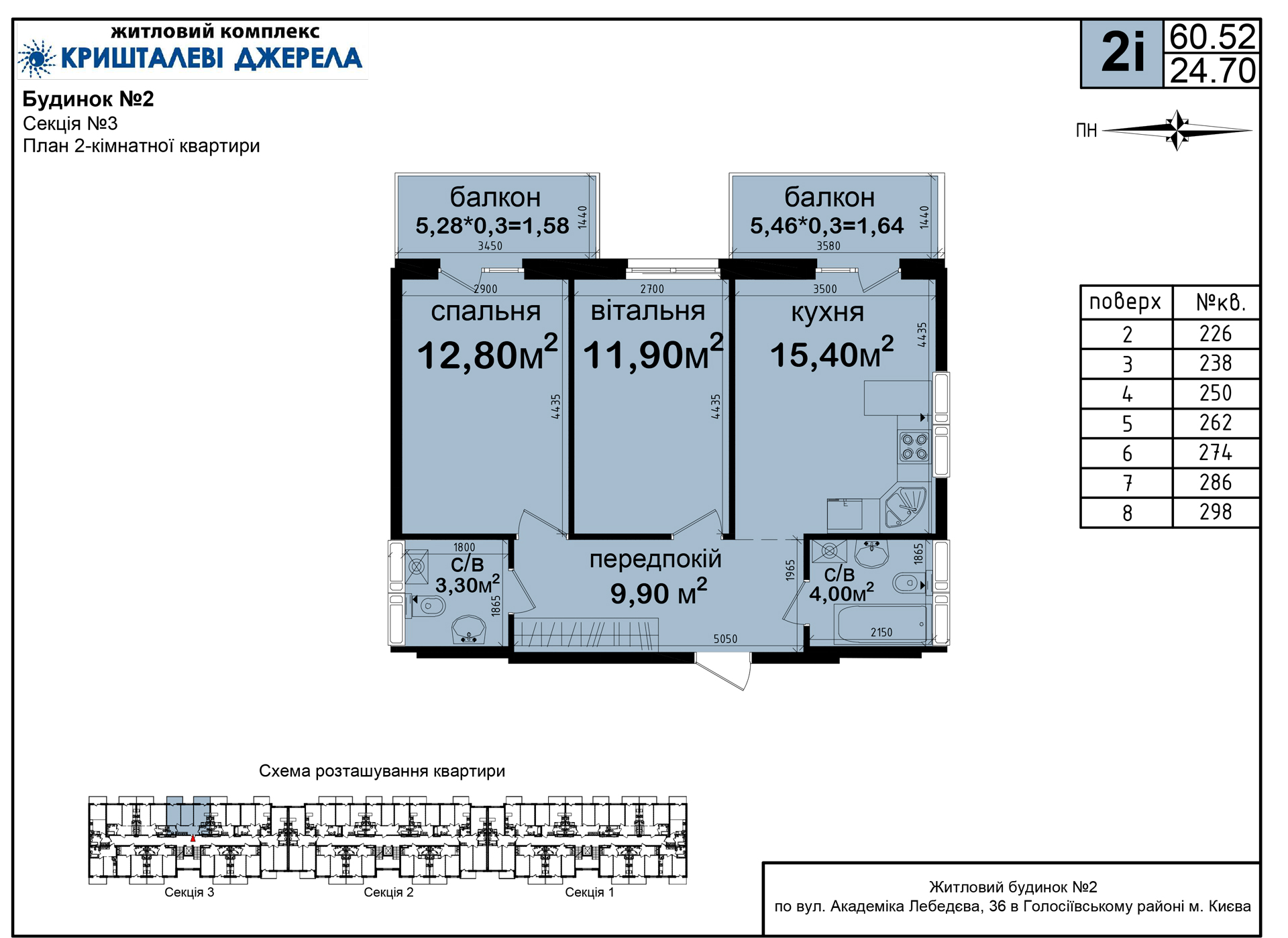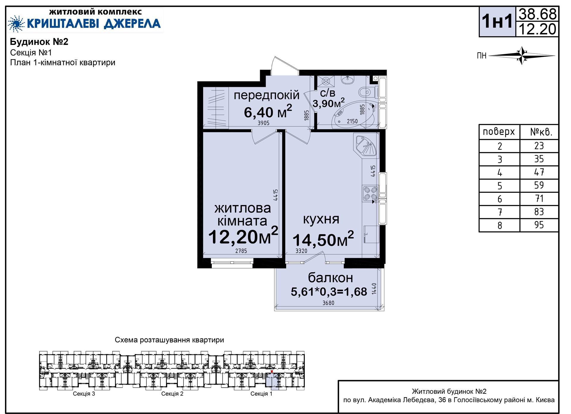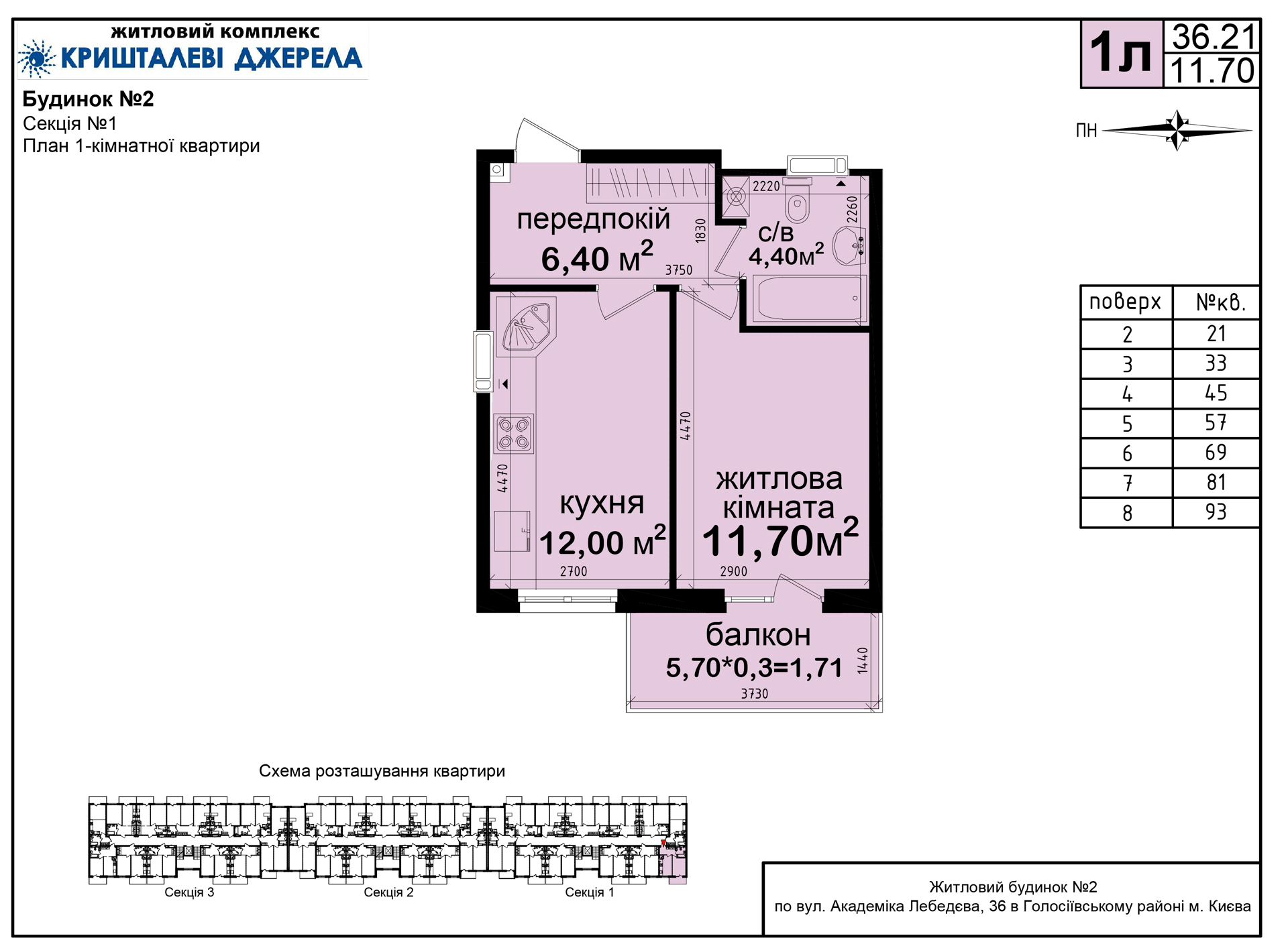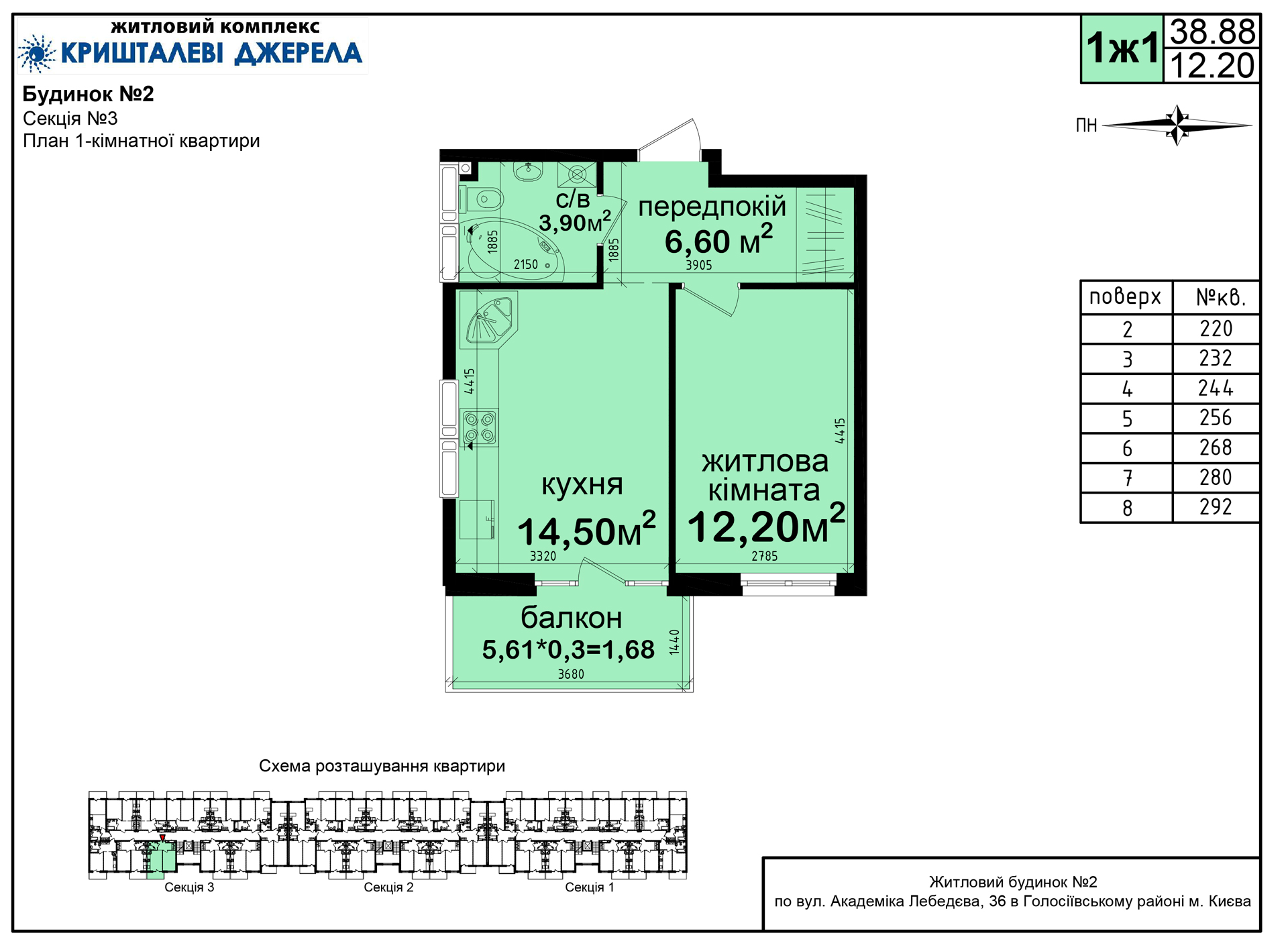 | № | Секція | Поверх | Кімнат | Площа, м2 | Ціна, грн/м2 | Ціна, грн | Статус |