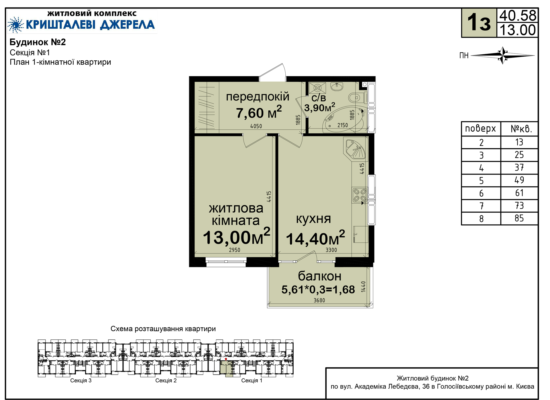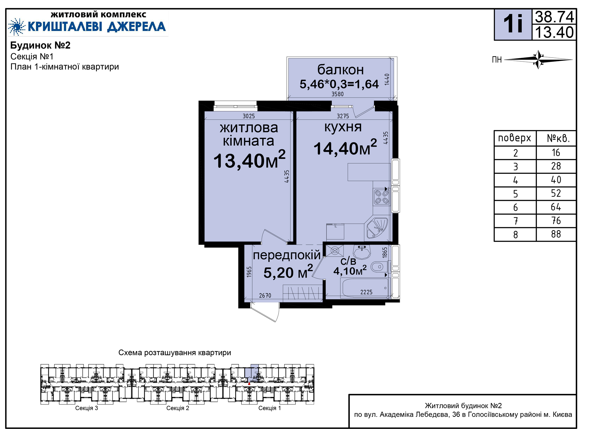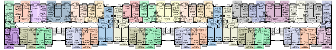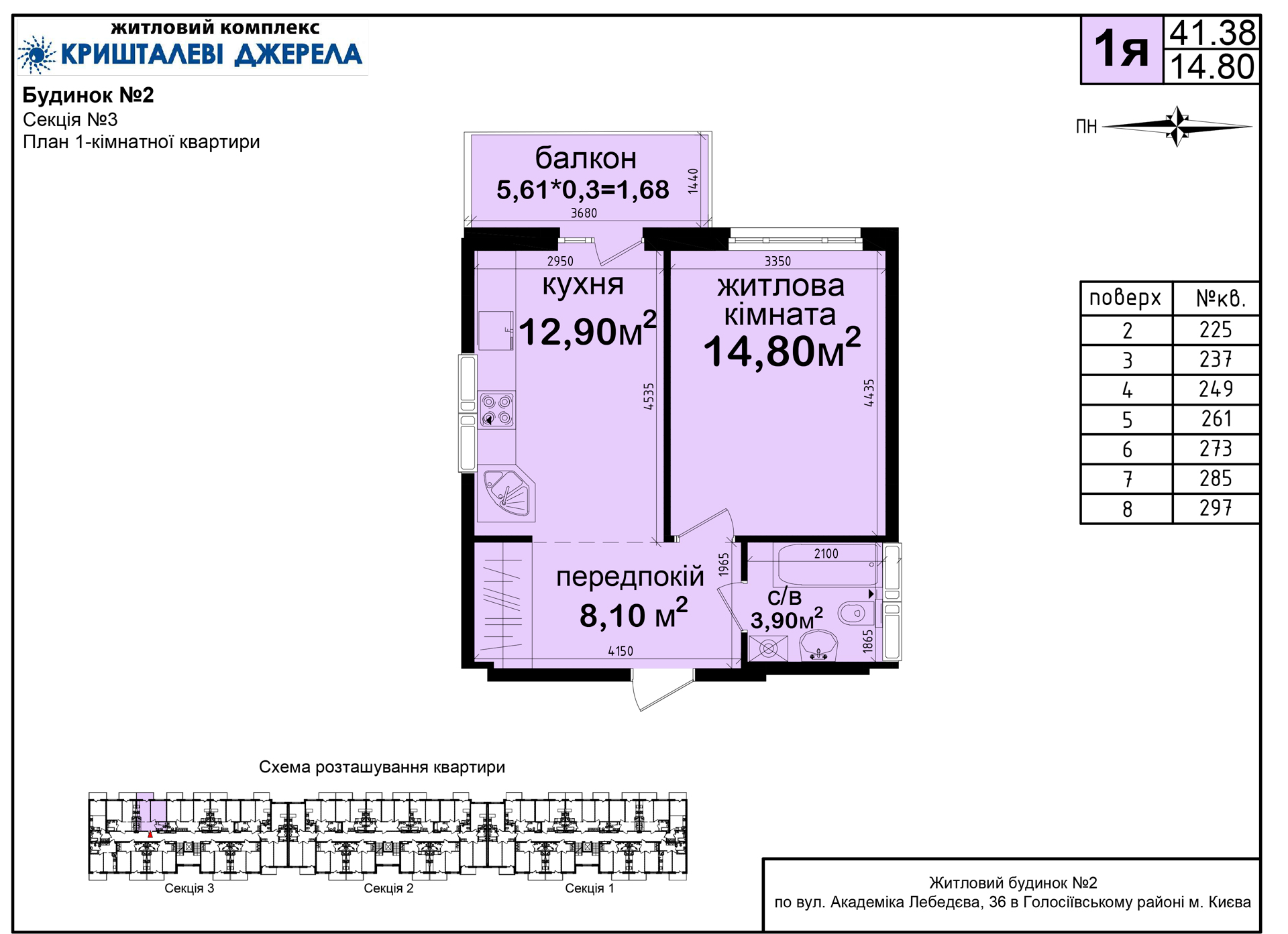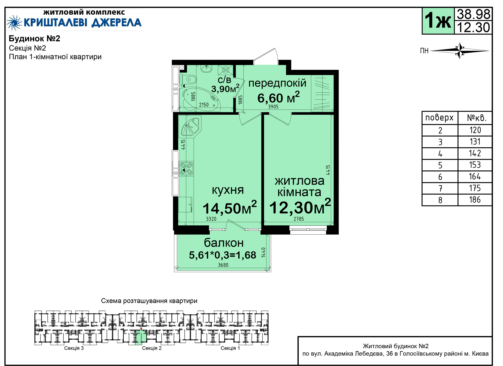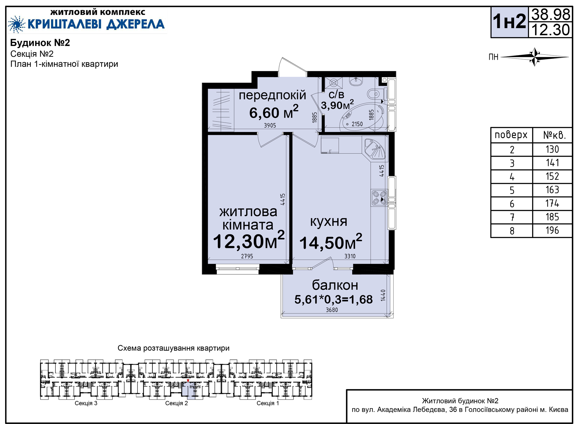 | № | Секція | Поверх | Кімнат | Площа, м2 | Ціна, грн/м2 | Ціна, грн | Статус |