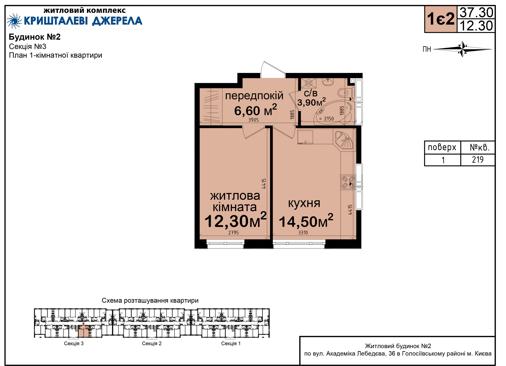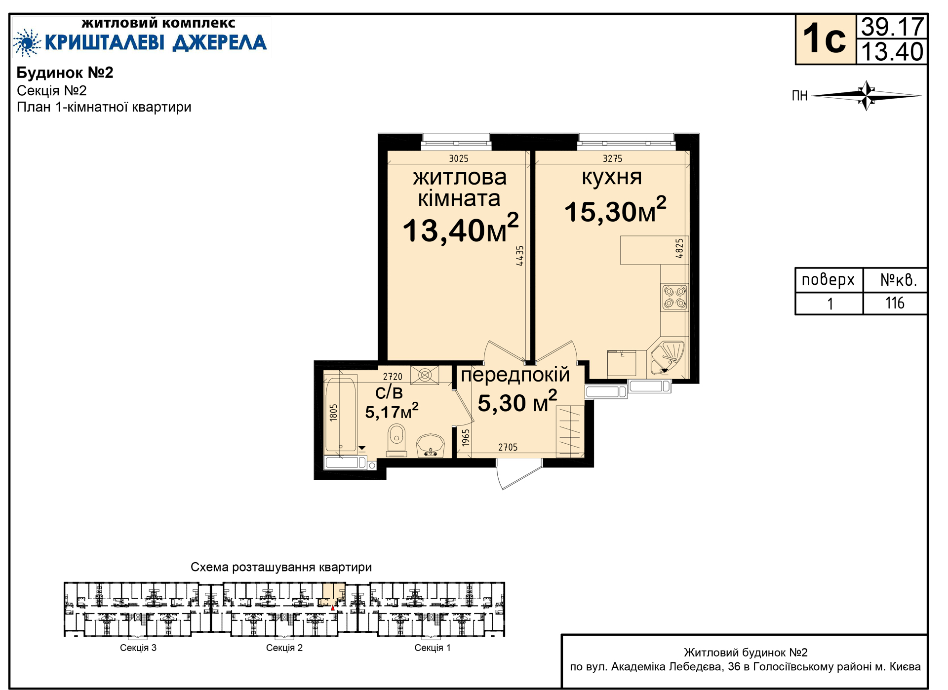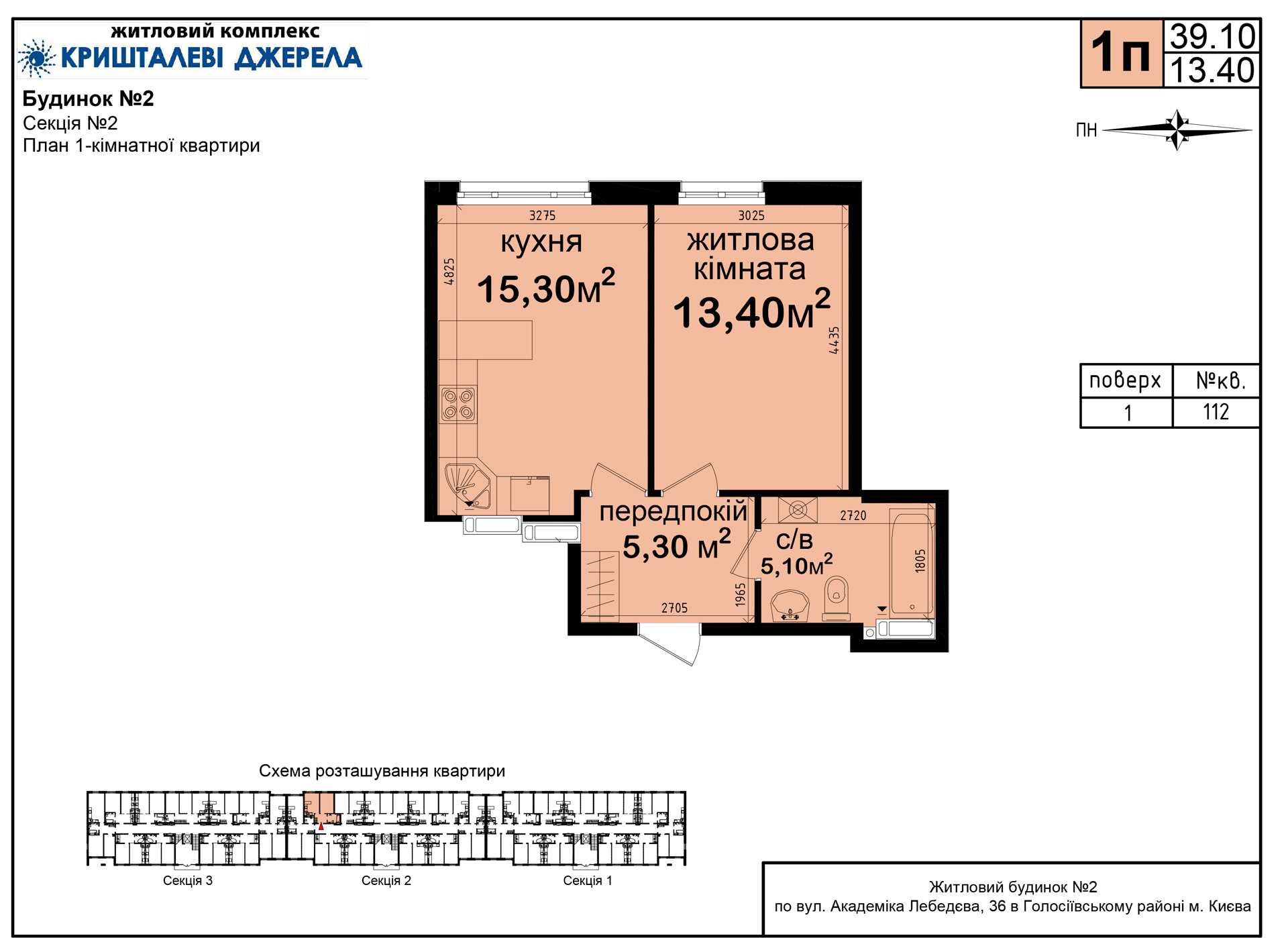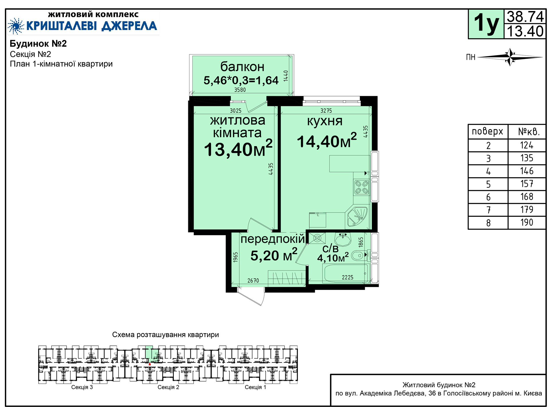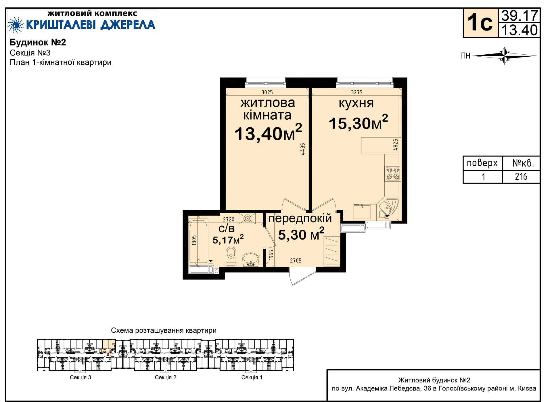 | № | Секція | Поверх | Кімнат | Площа, м2 | Ціна, грн/м2 | Ціна, грн | Статус |
