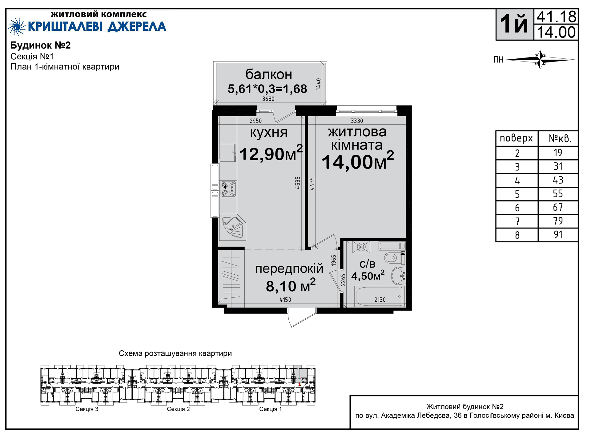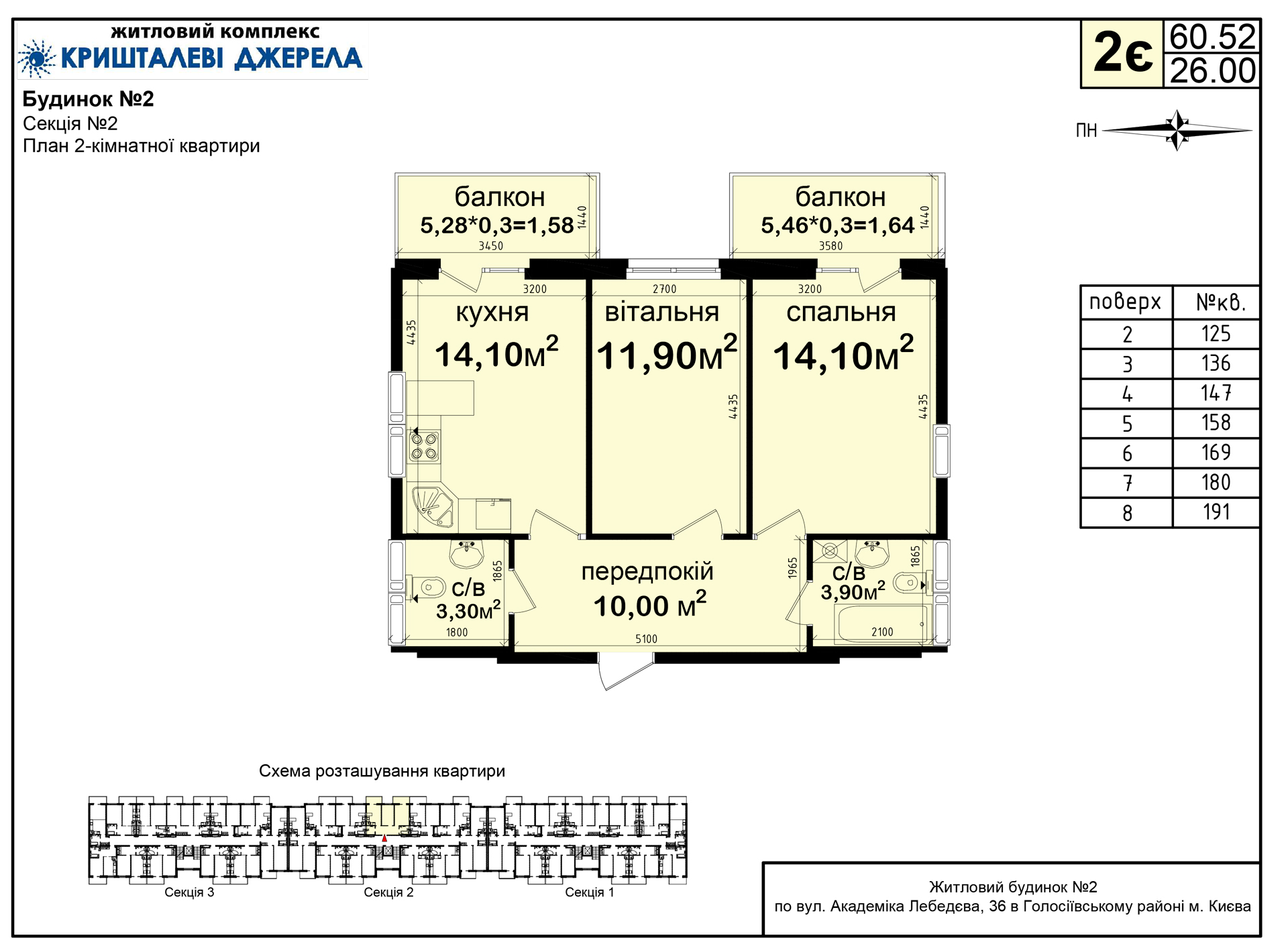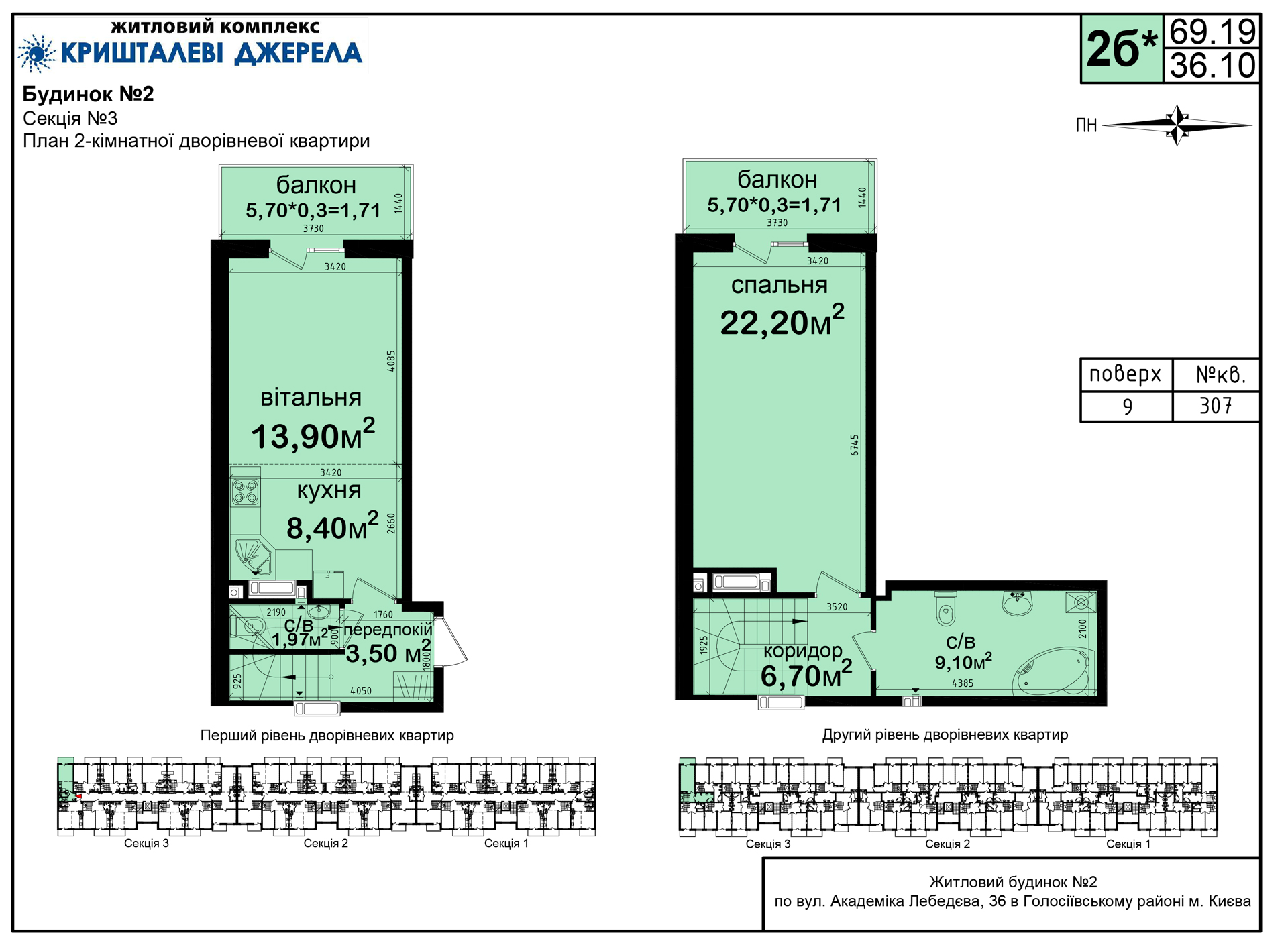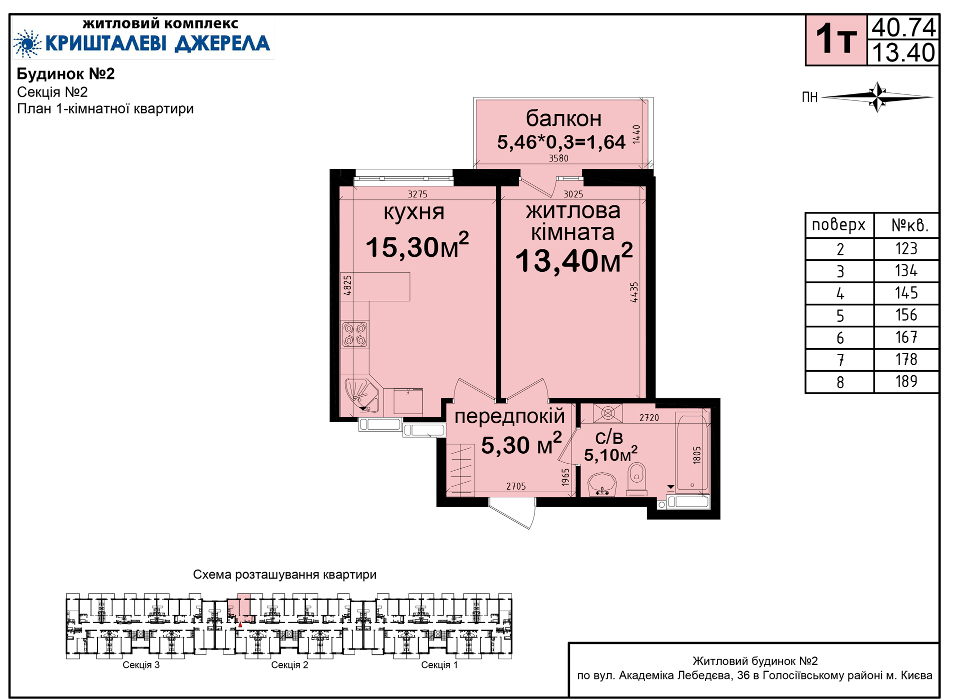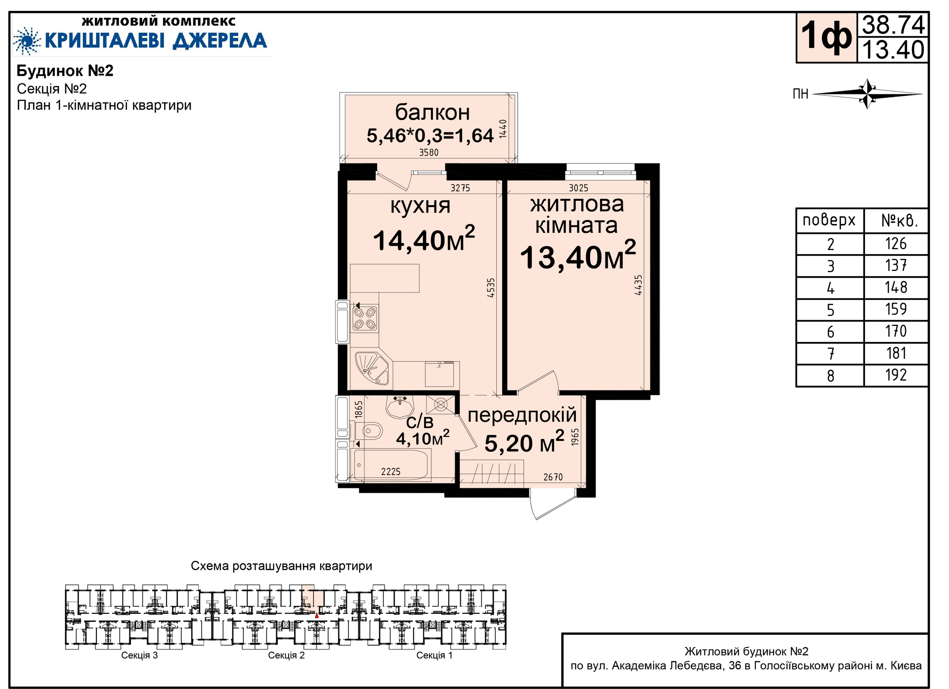 | № | Секція | Поверх | Кімнат | Площа, м2 | Ціна, грн/м2 | Ціна, грн | Статус |