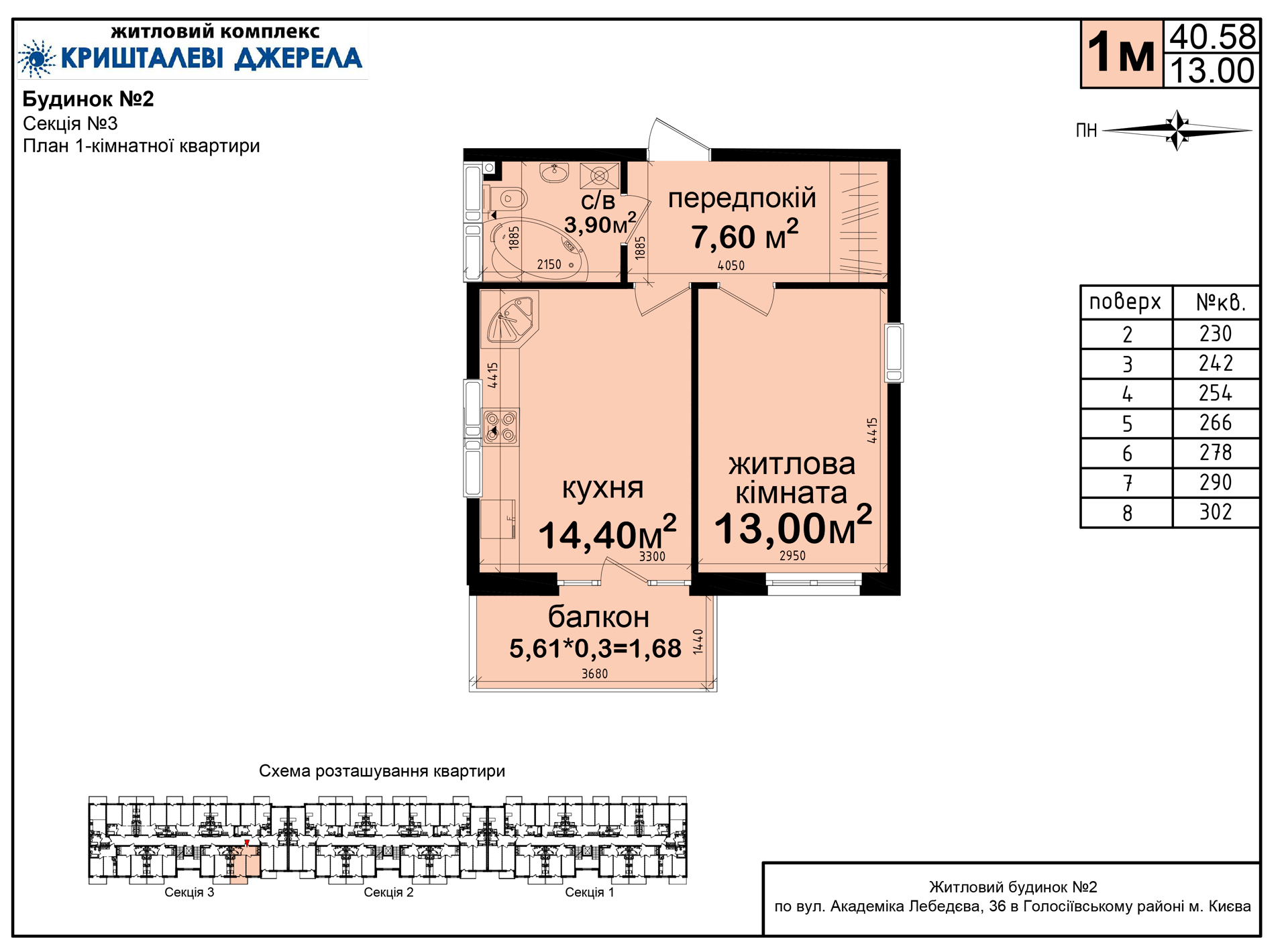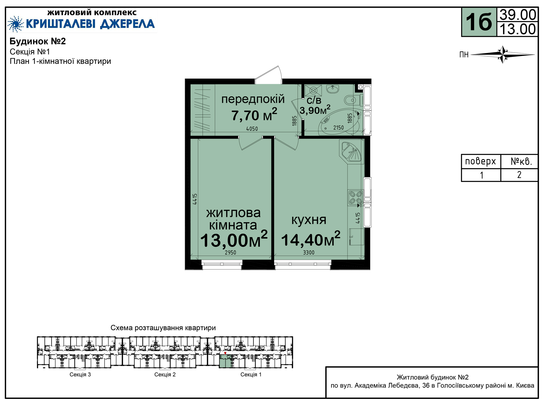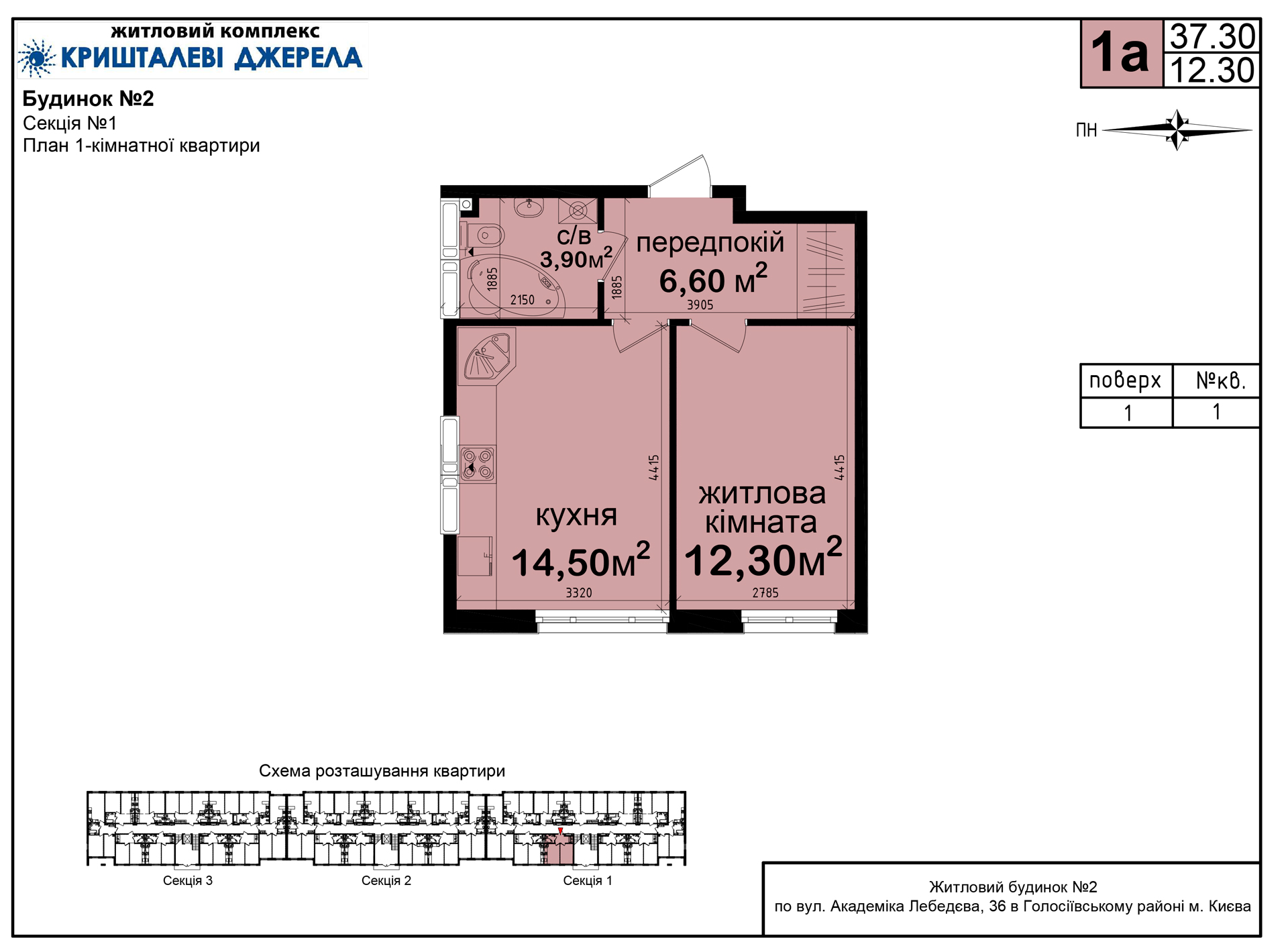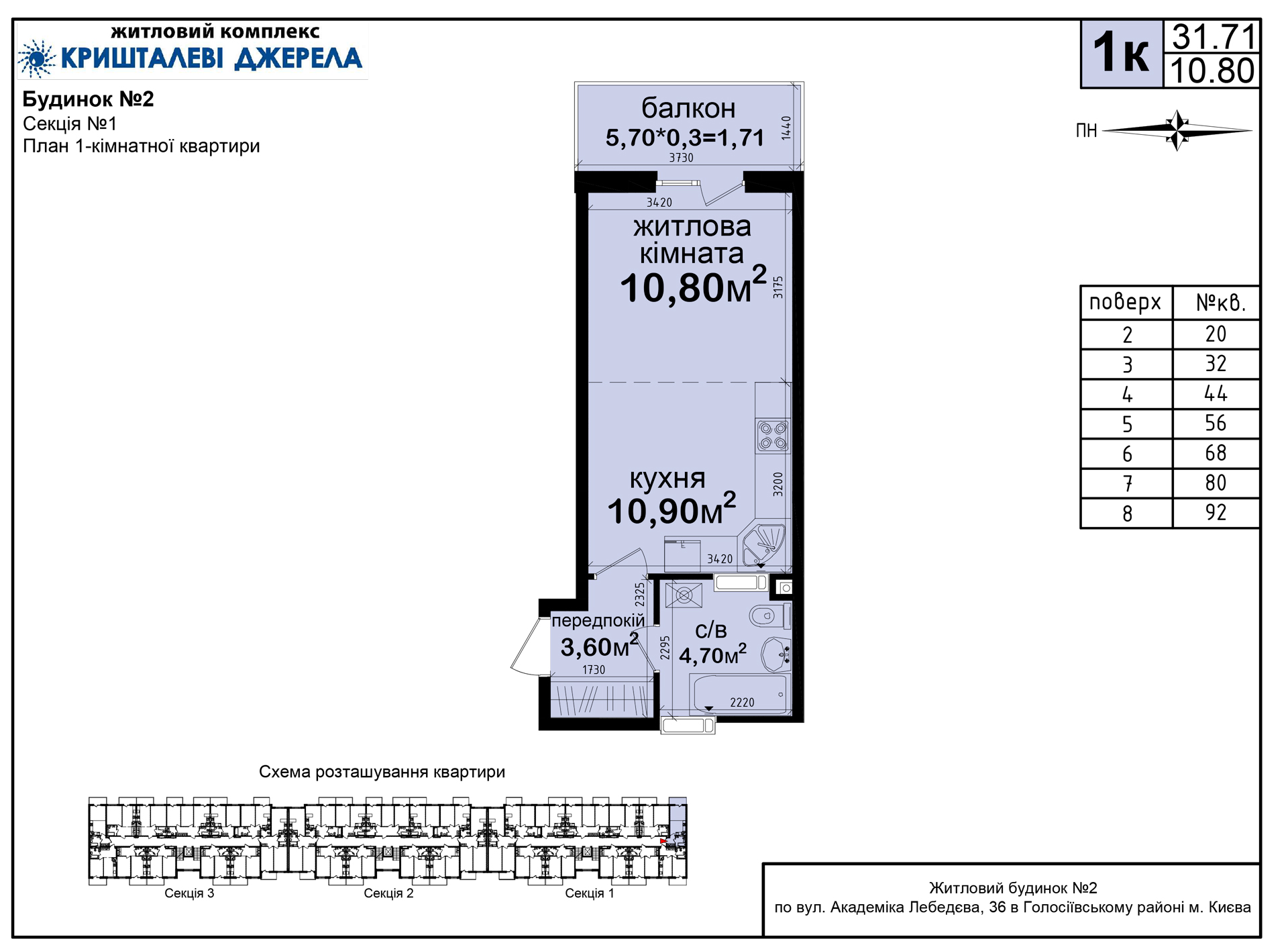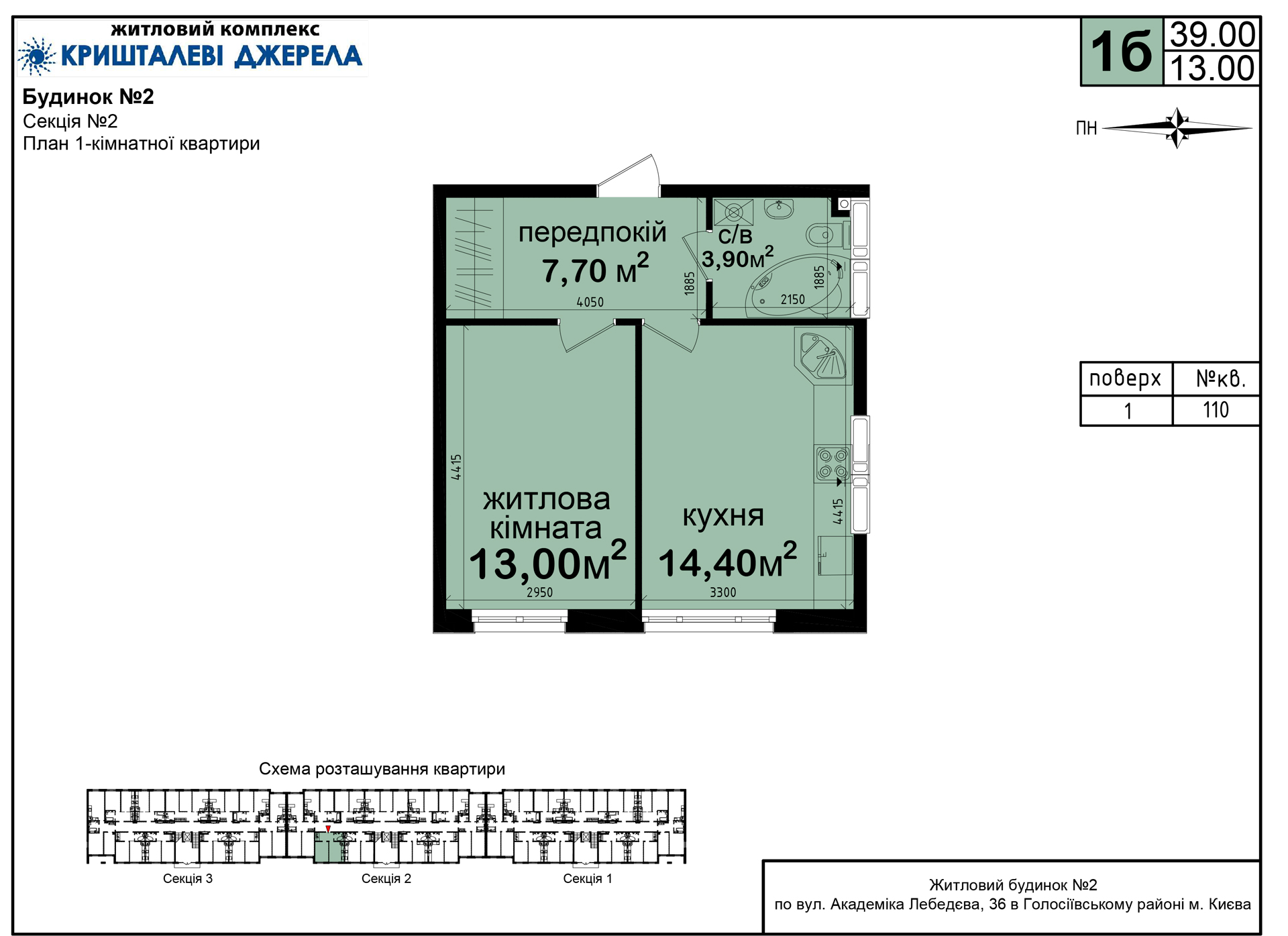 | № | Секція | Поверх | Кімнат | Площа, м2 | Ціна, грн/м2 | Ціна, грн | Статус |