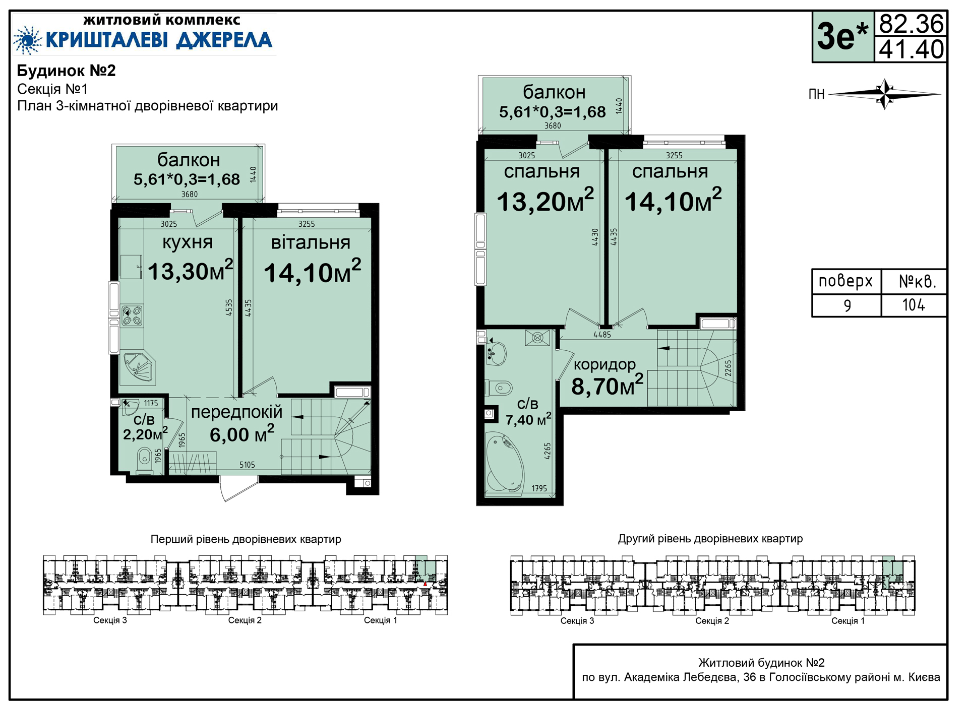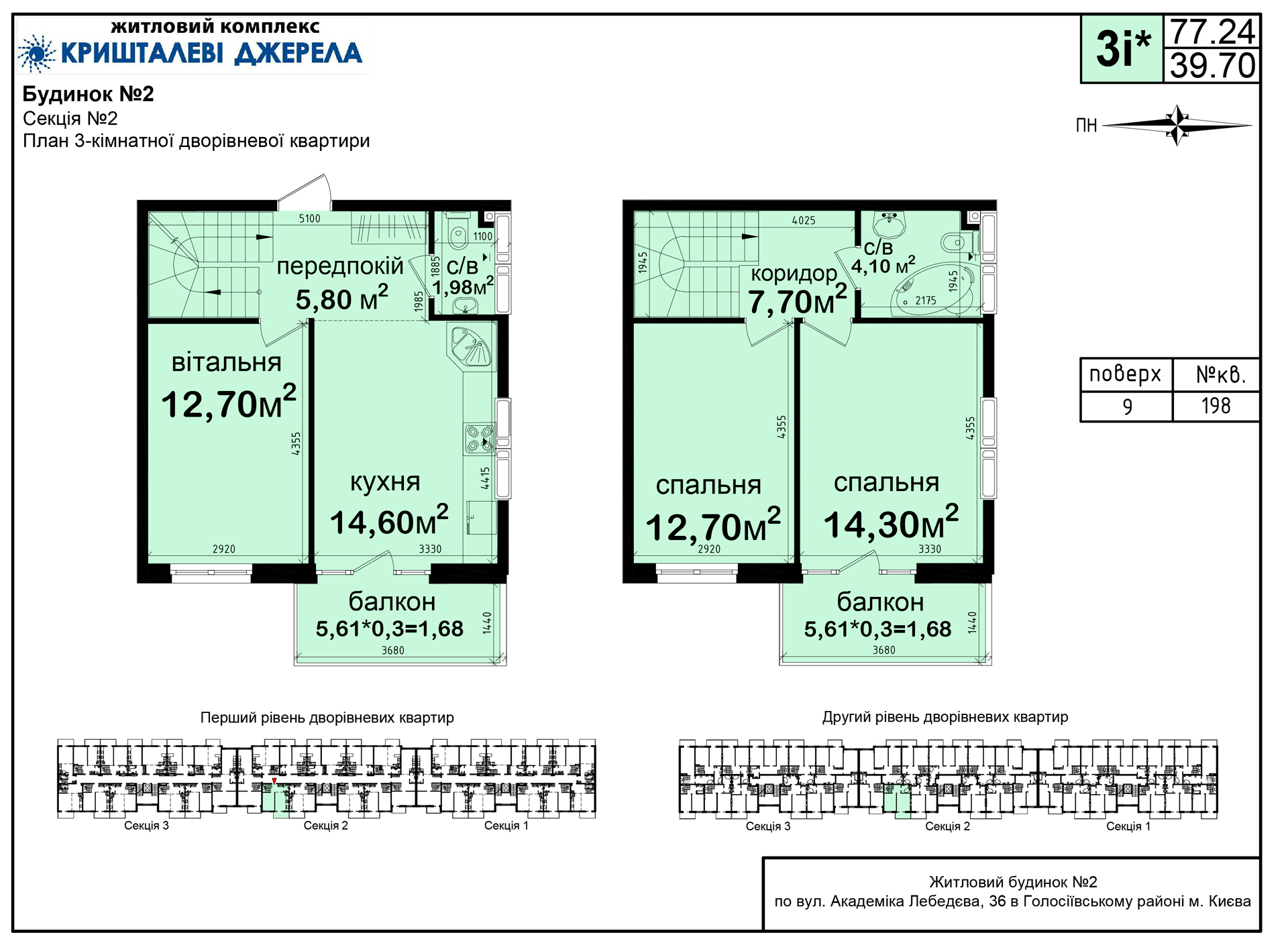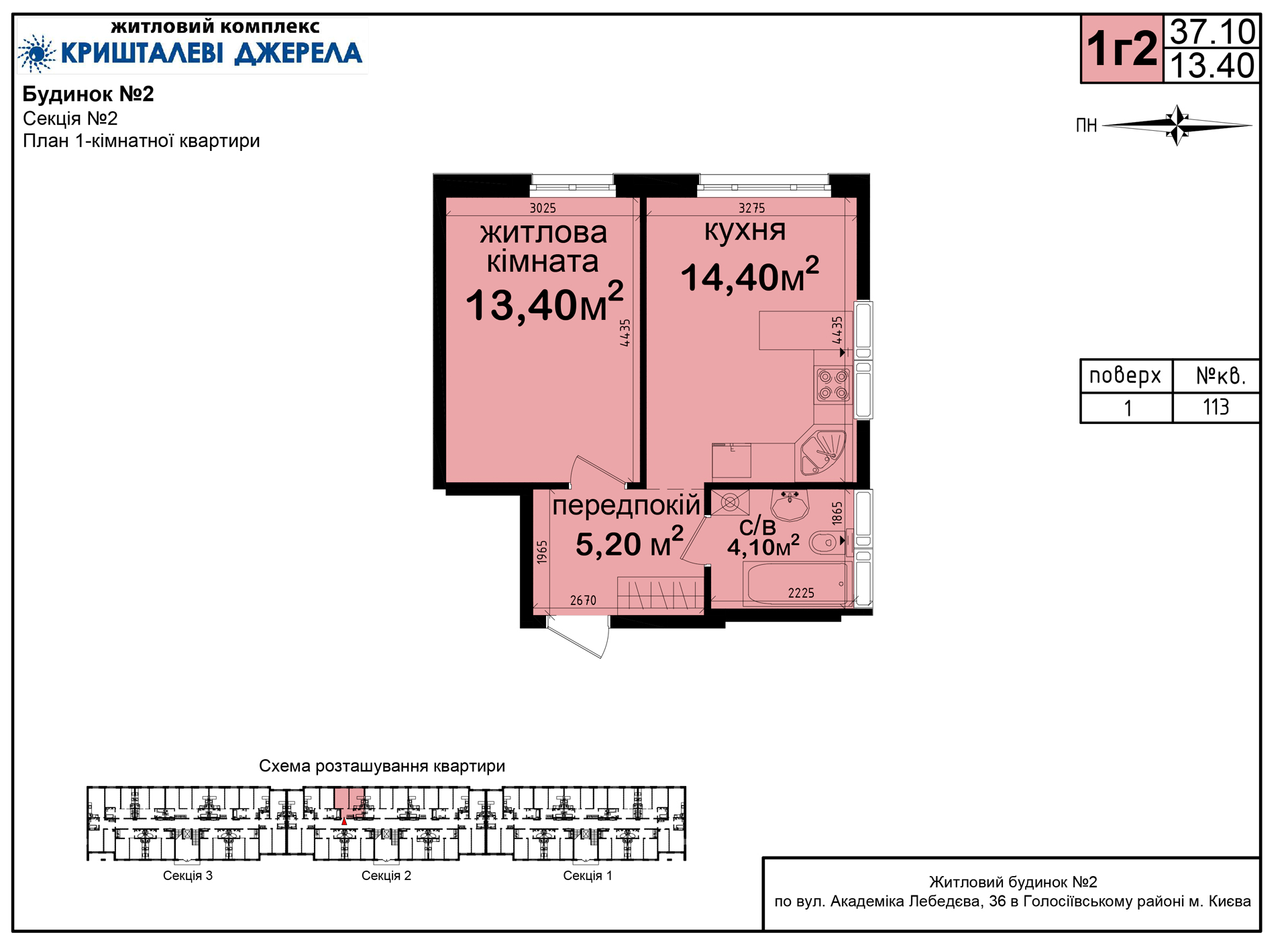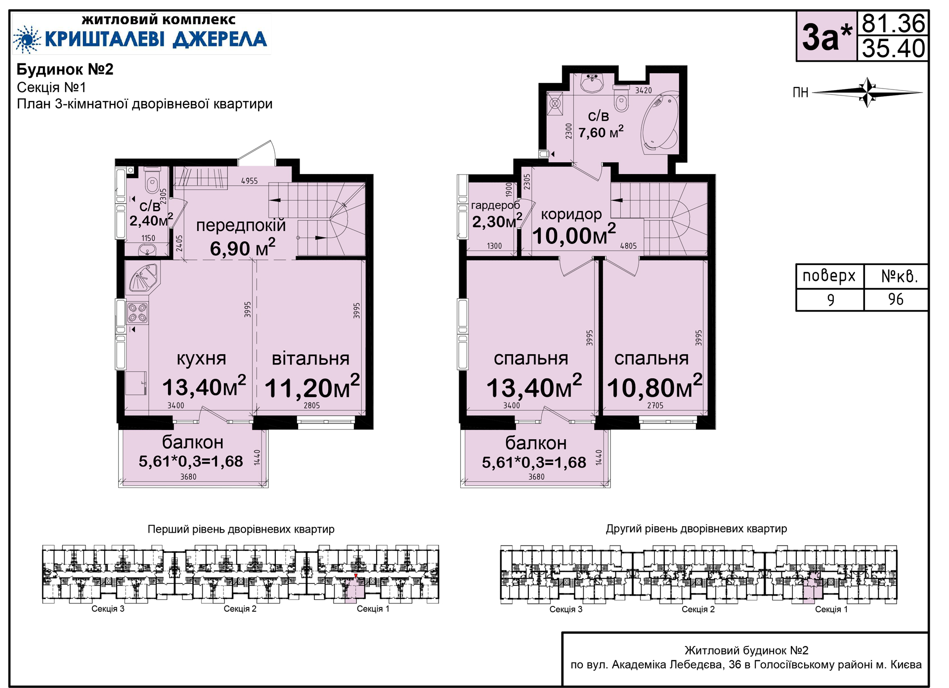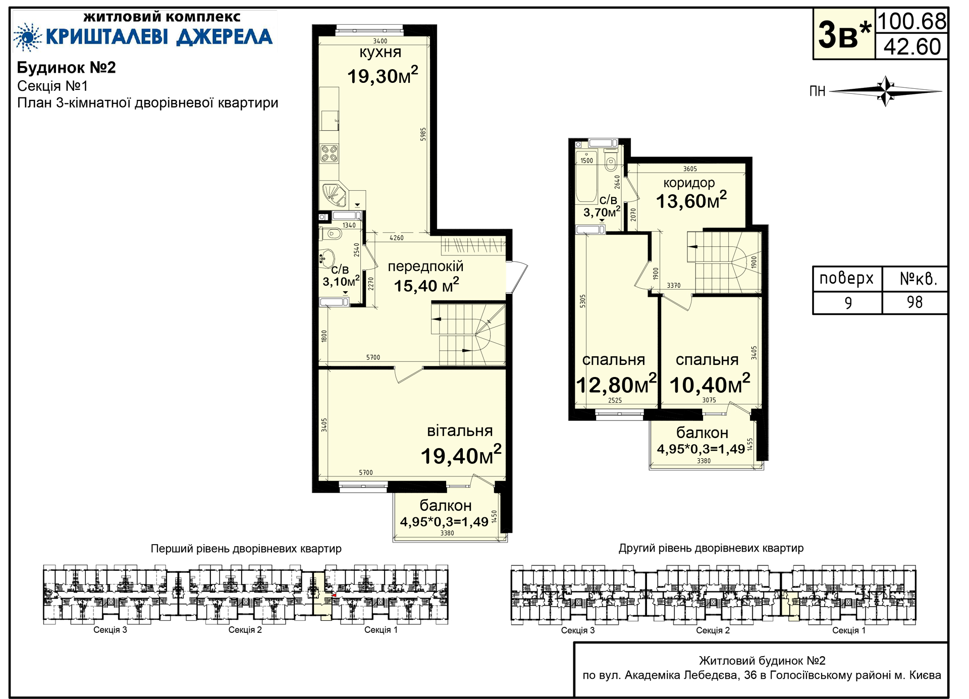 | № | Секція | Поверх | Кімнат | Площа, м2 | Ціна, грн/м2 | Ціна, грн | Статус |
