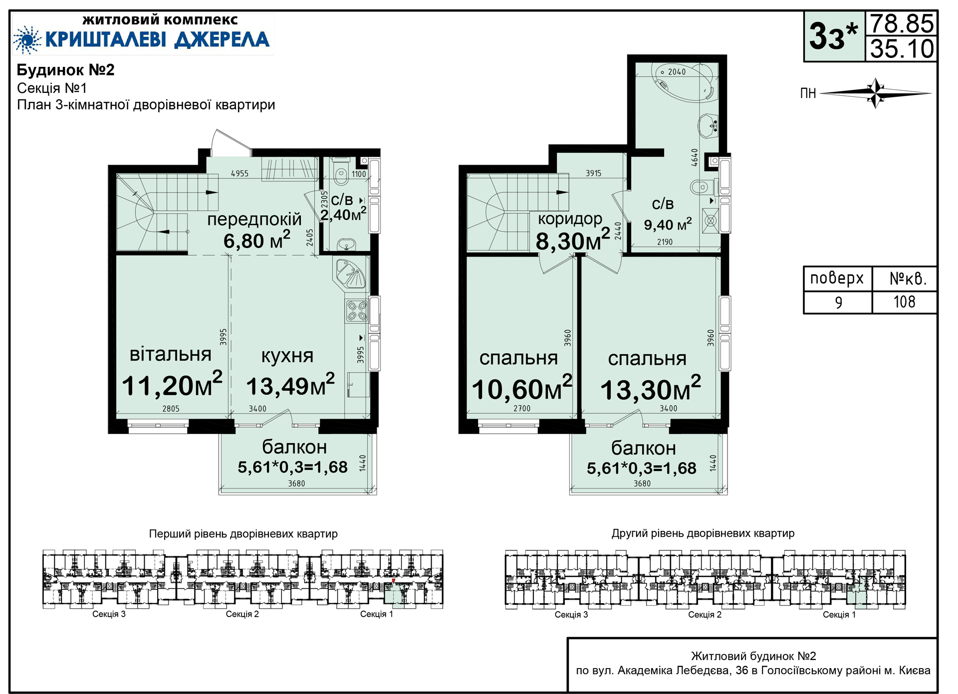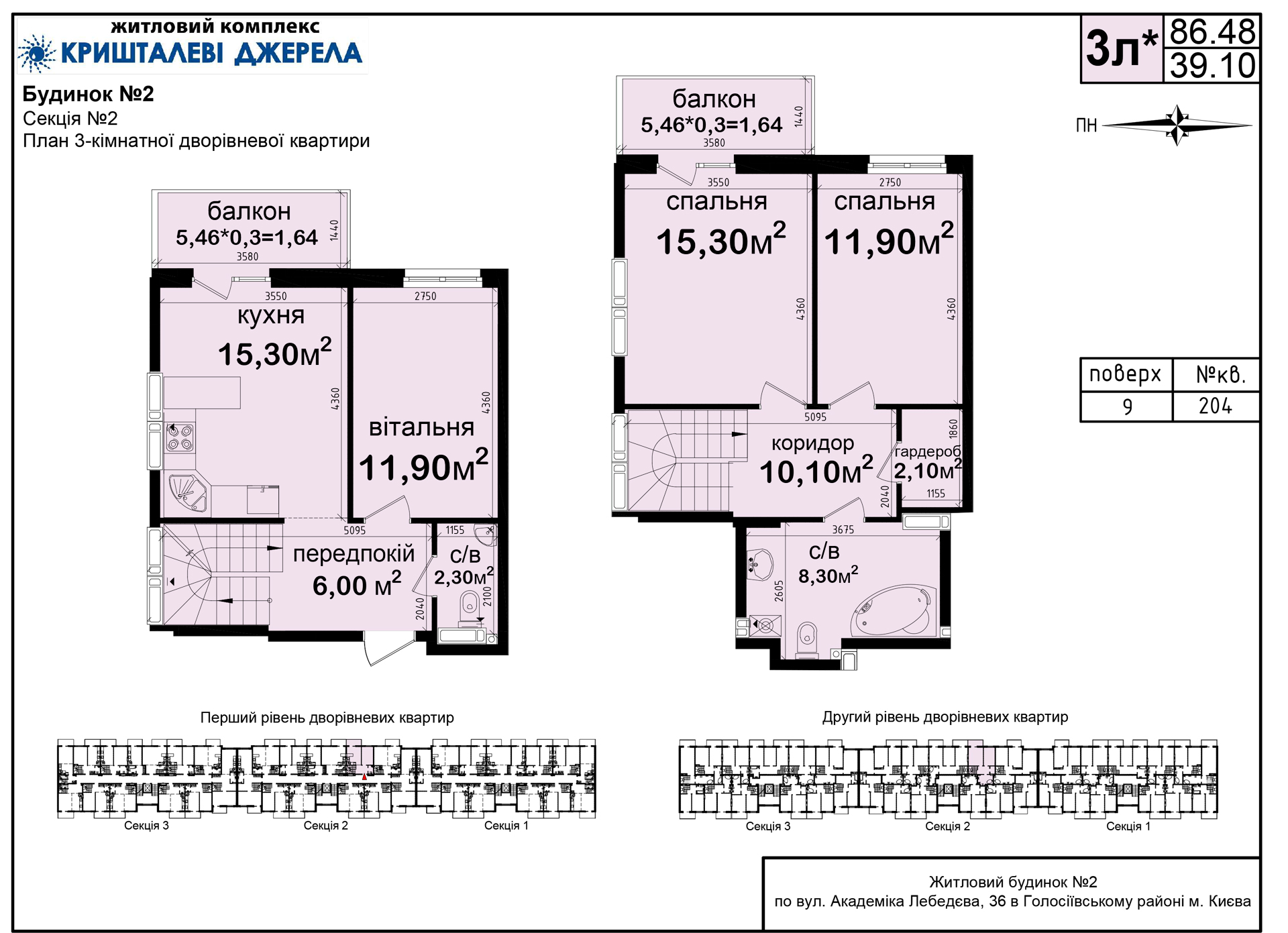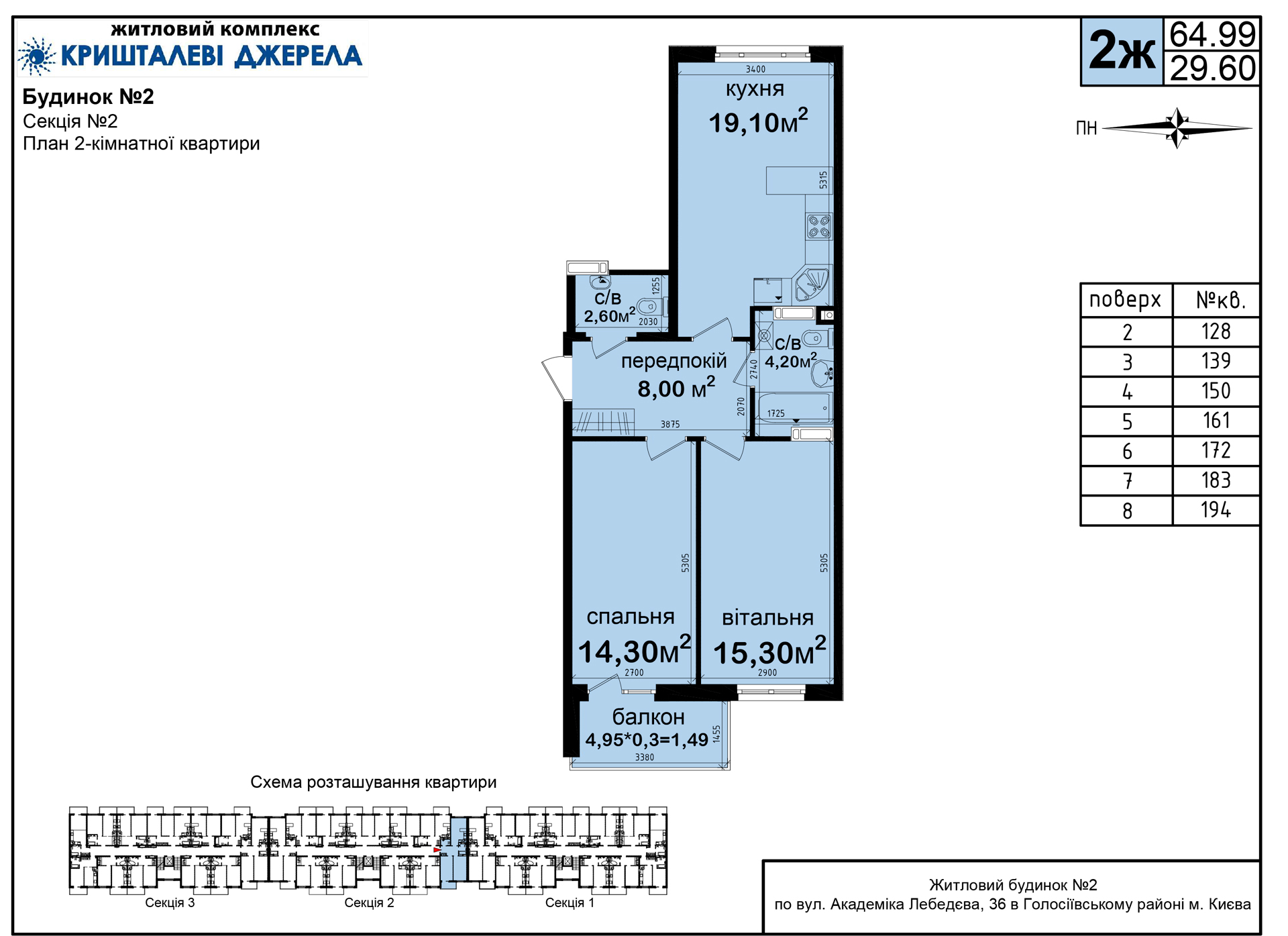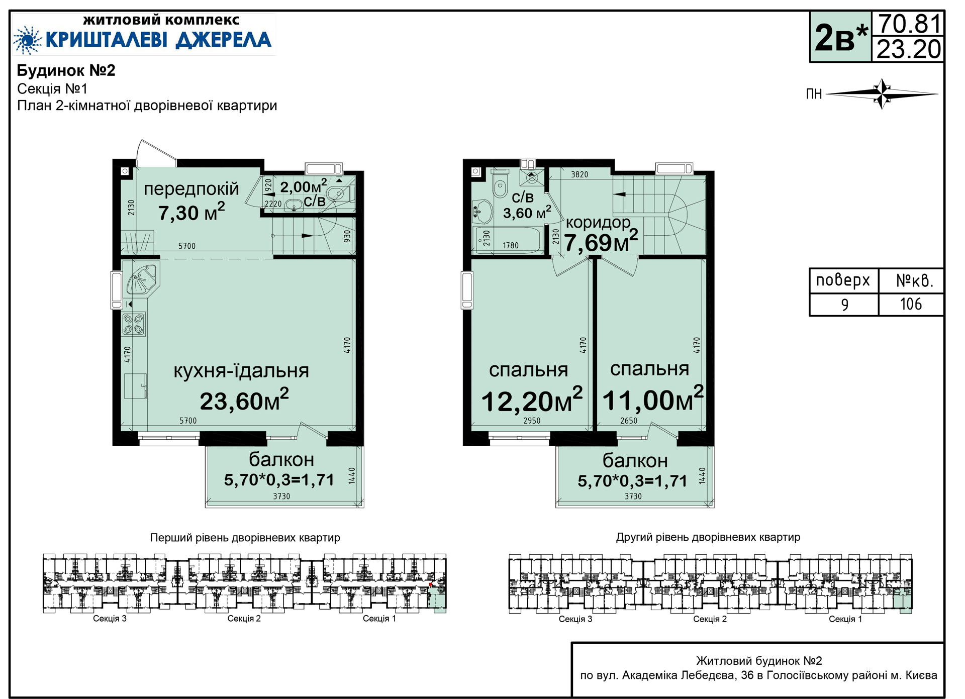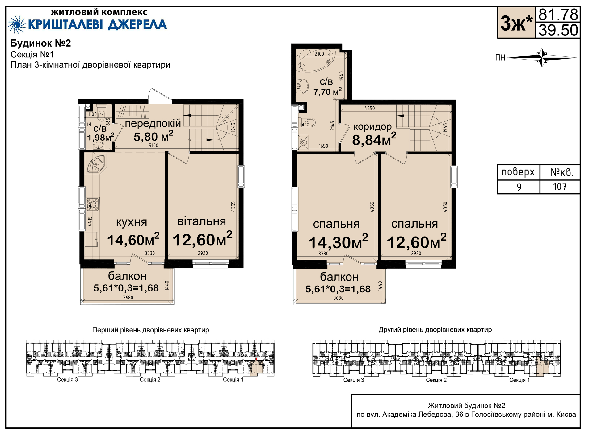 | № | Секція | Поверх | Кімнат | Площа, м2 | Ціна, грн/м2 | Ціна, грн | Статус |