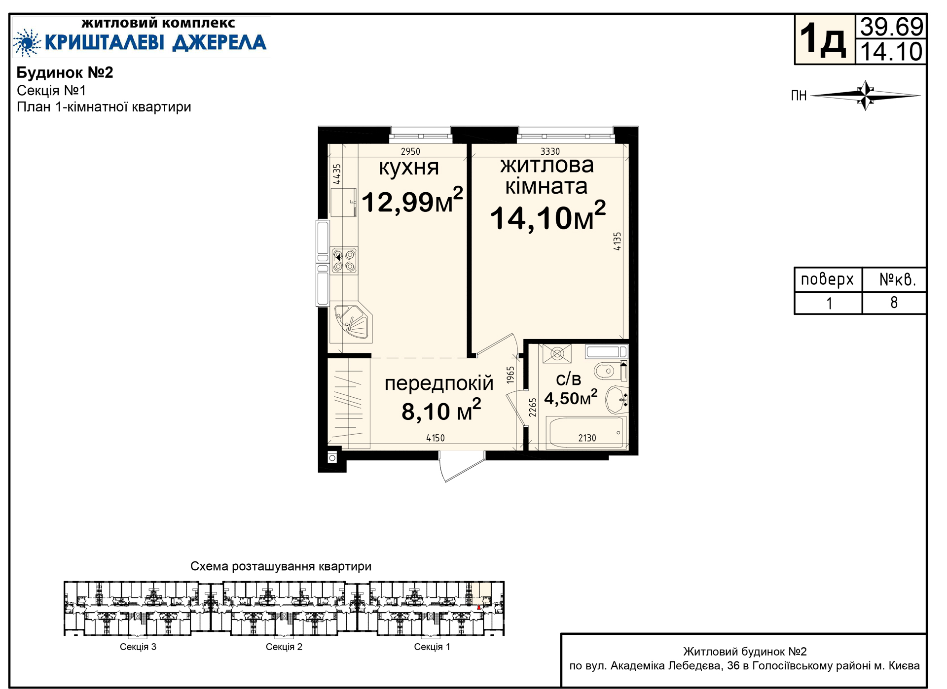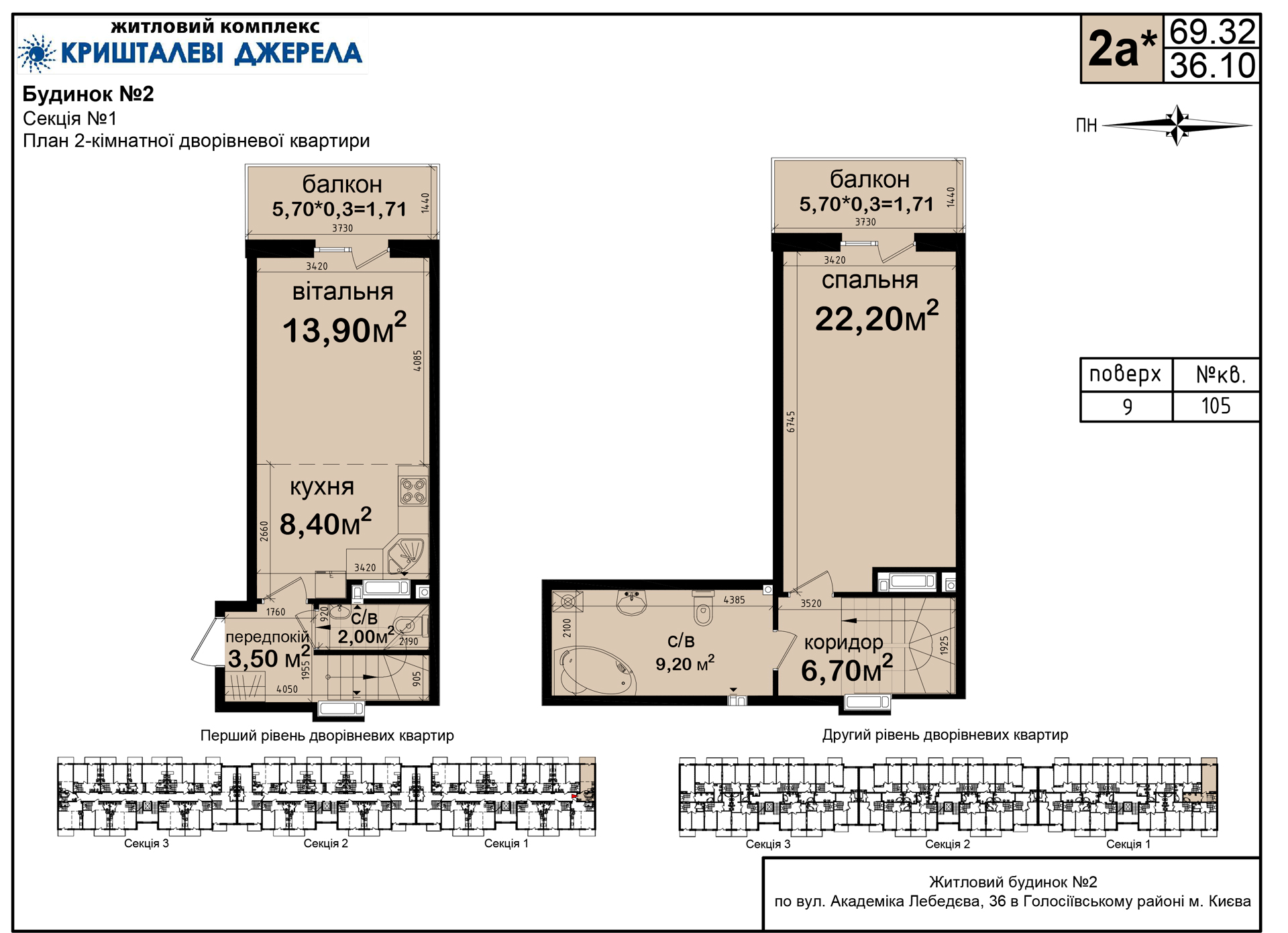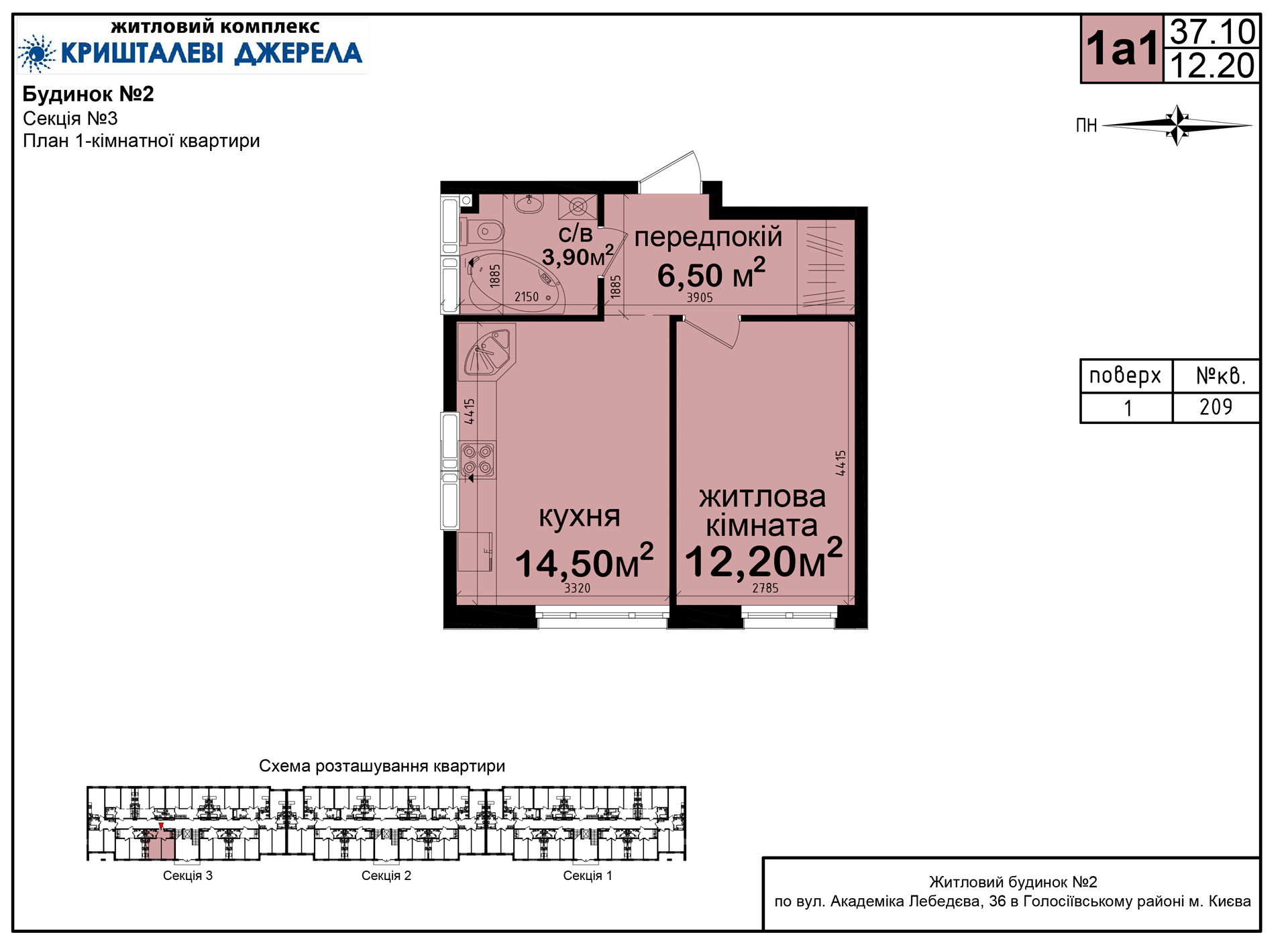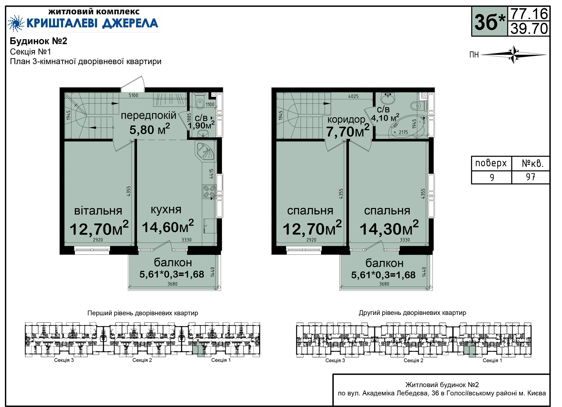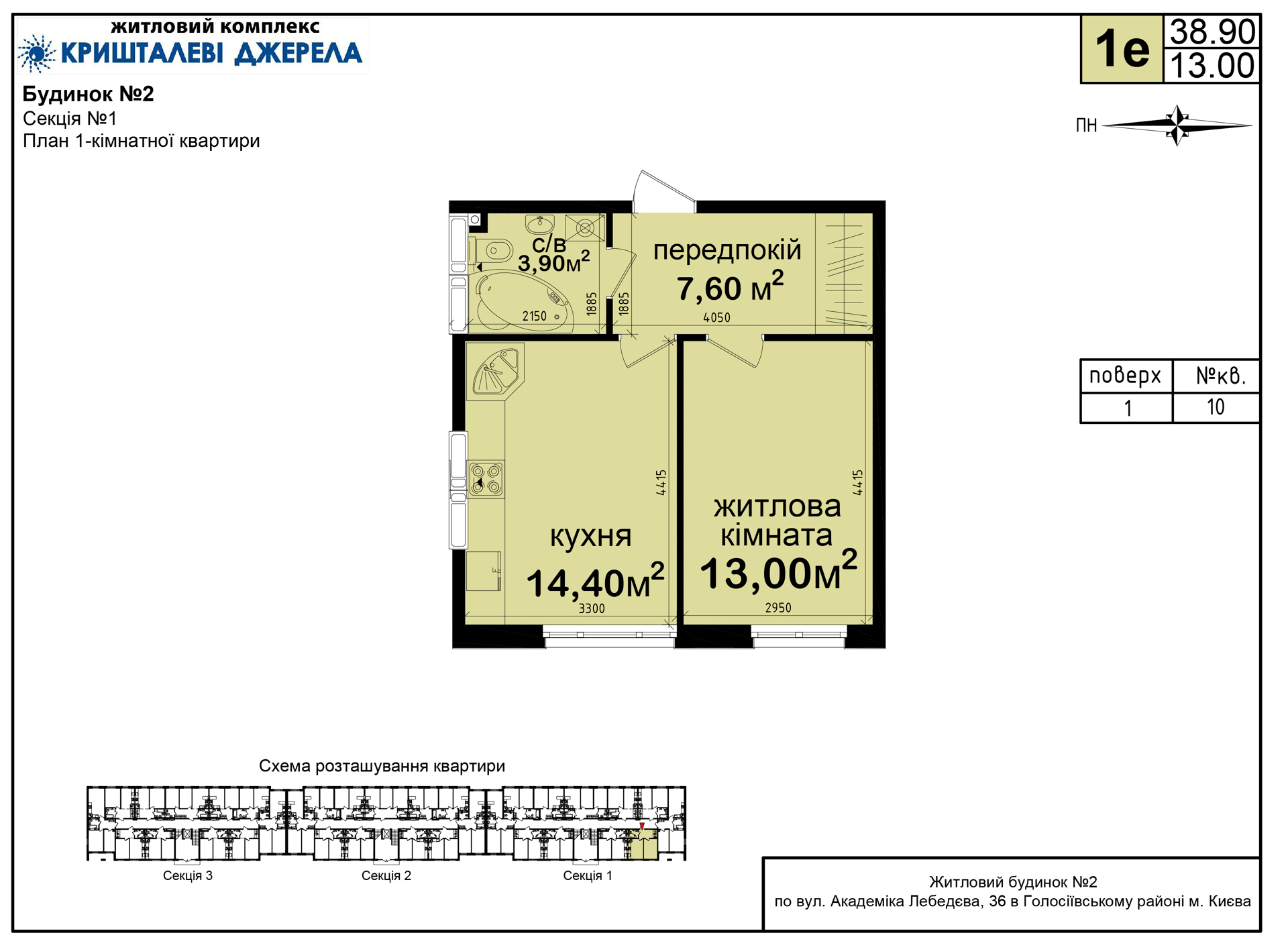 | № | Секція | Поверх | Кімнат | Площа, м2 | Ціна, грн/м2 | Ціна, грн | Статус |