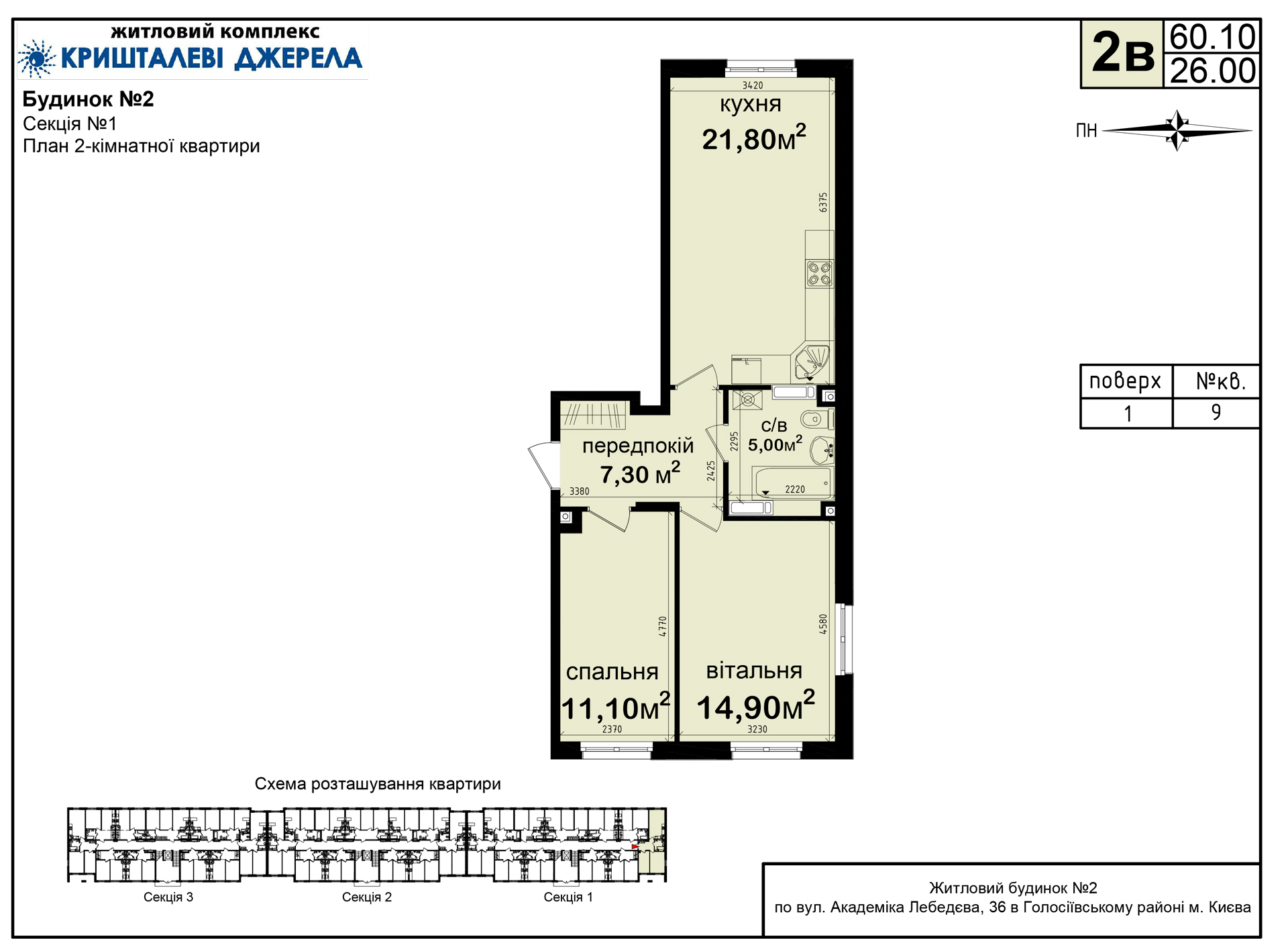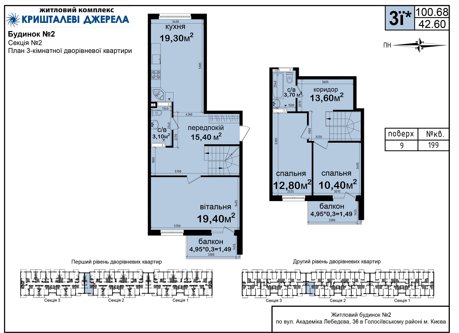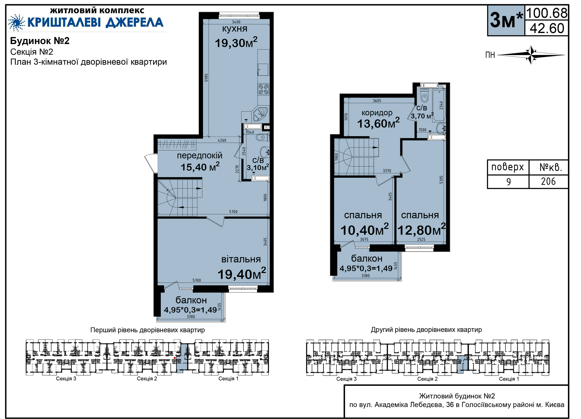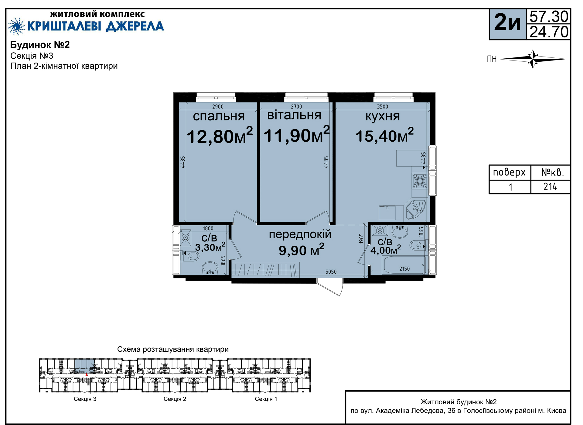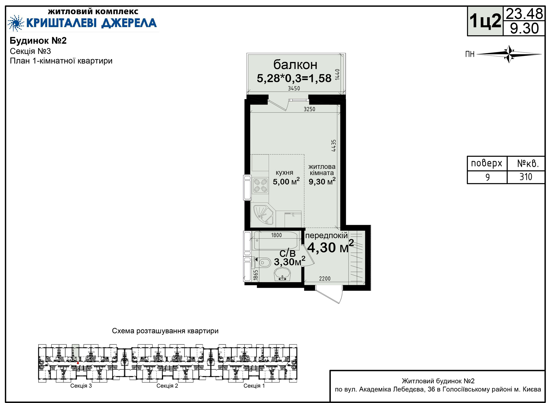 | № | Секція | Поверх | Кімнат | Площа, м2 | Ціна, грн/м2 | Ціна, грн | Статус |
